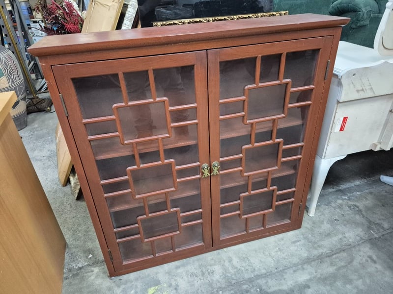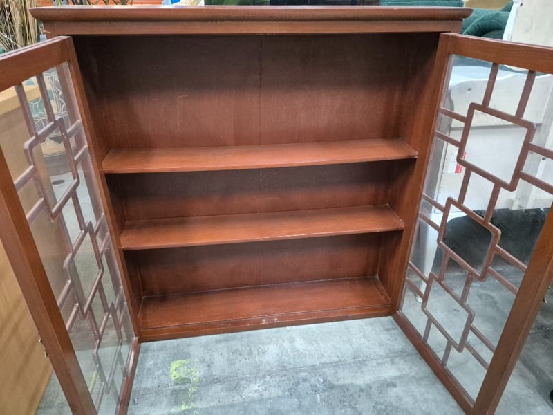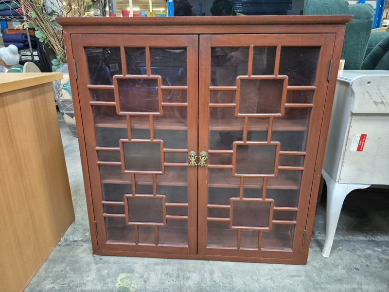 Display Cabinet, two shelves, stained timber styleDimensions: H 92cm x W 90.5cm x D 21cm