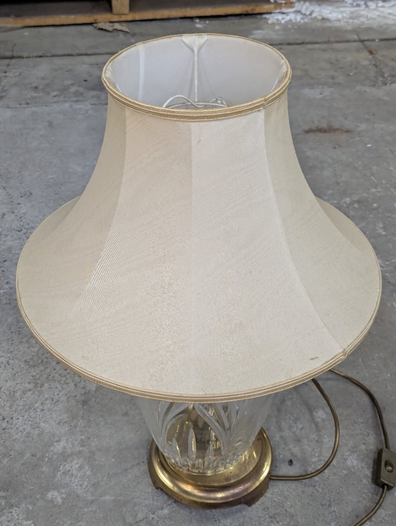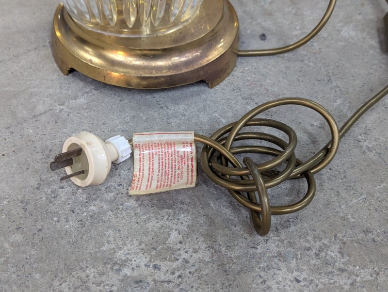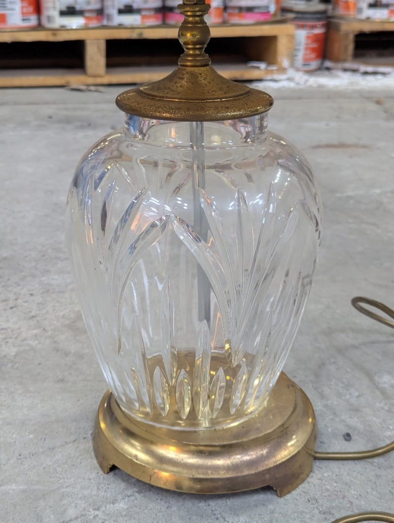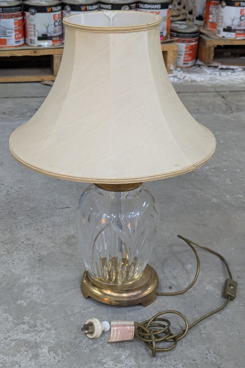 Classic brass table lamp featuring a cut crystal urn-form base with vertical fluting detail and brass collar. The lamp is topped with a cream linen bell-shaped shade with gold trim. Original brass three-pin Australian plug with cord. The crystal base exhibits traditional craftsmanship with deep geometric cuts that refract light beautifully.