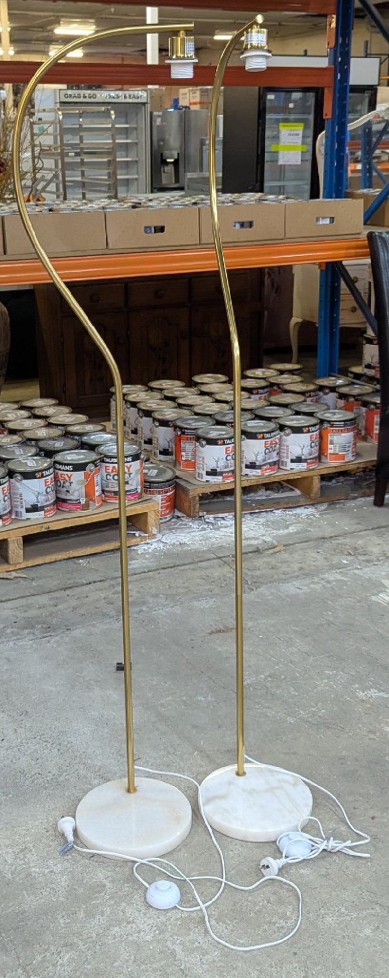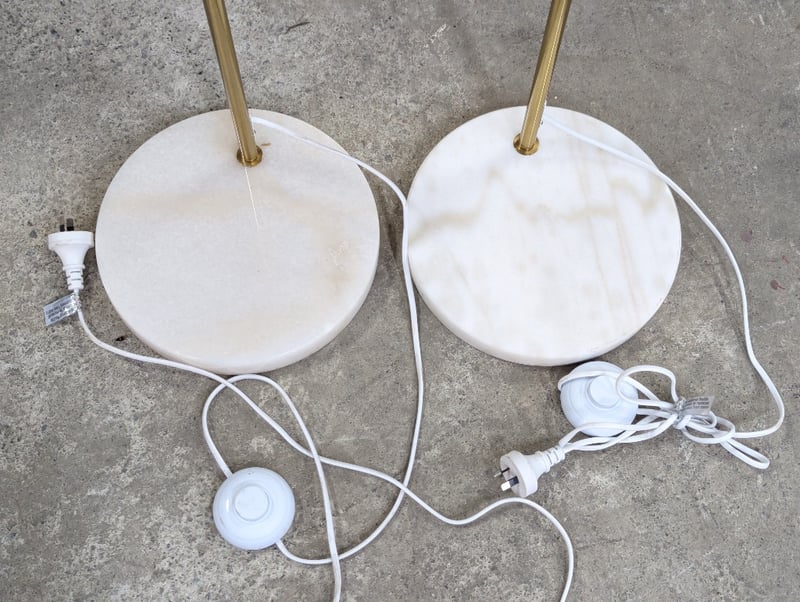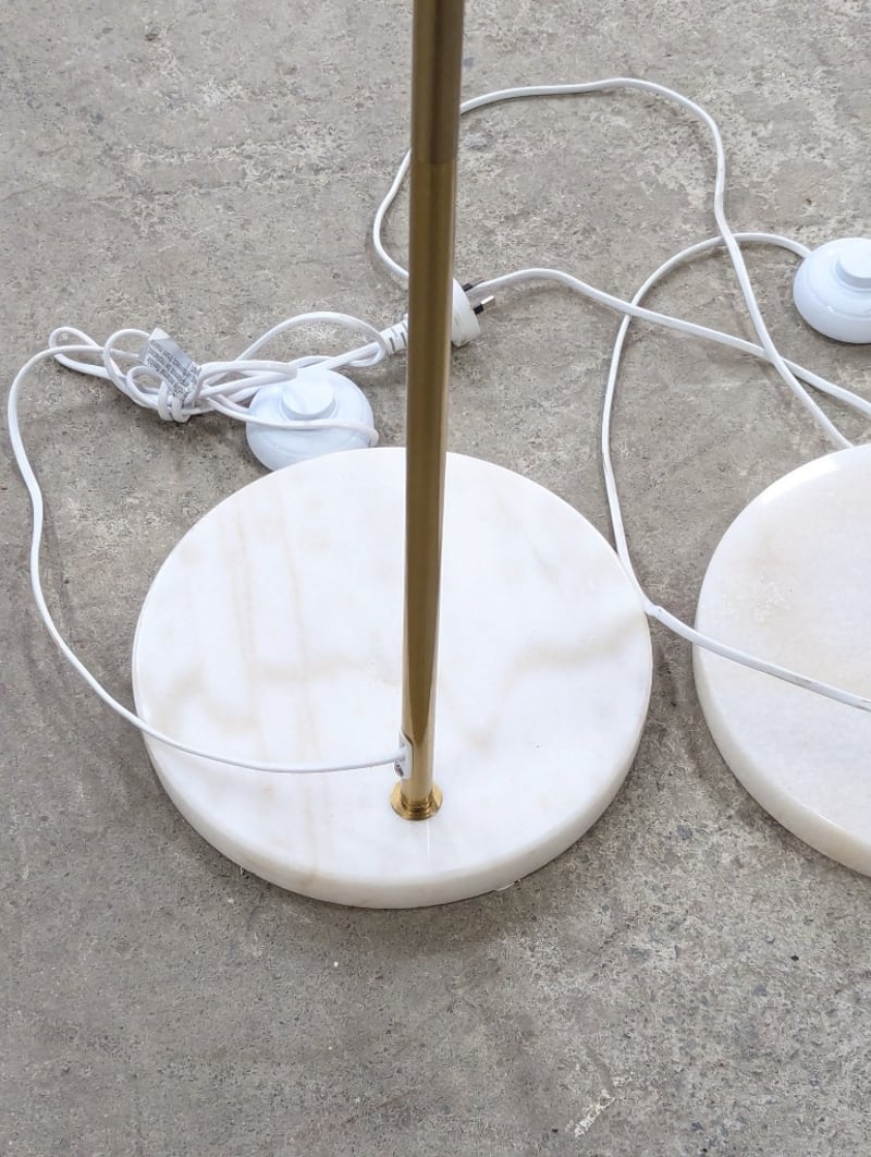 Two floor lamps, metal body with curved top, round marble style base, step switch
