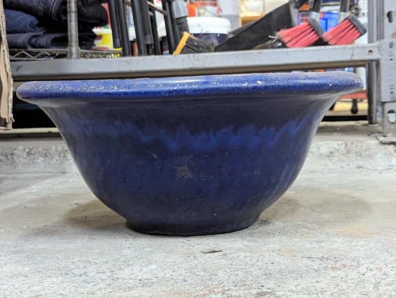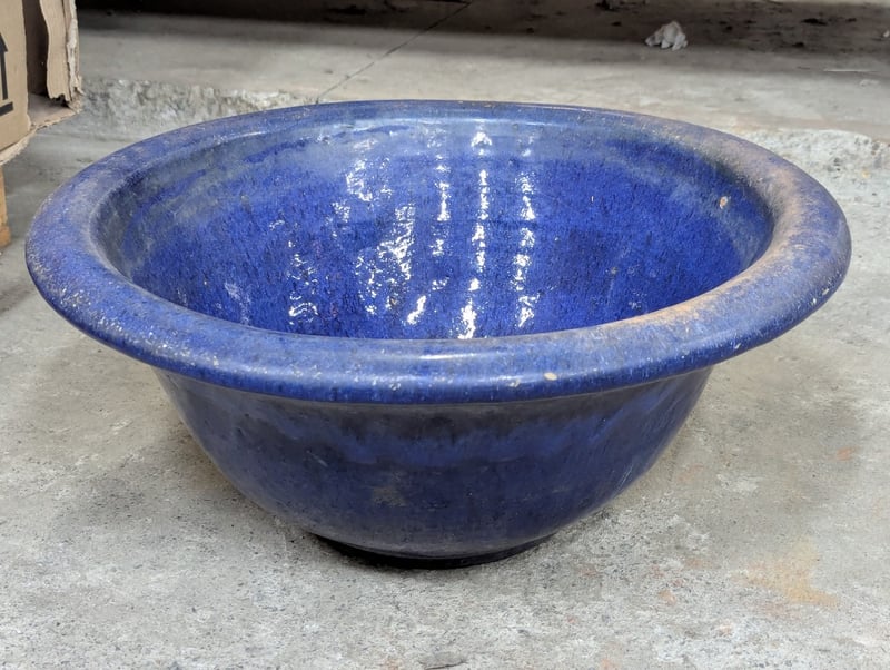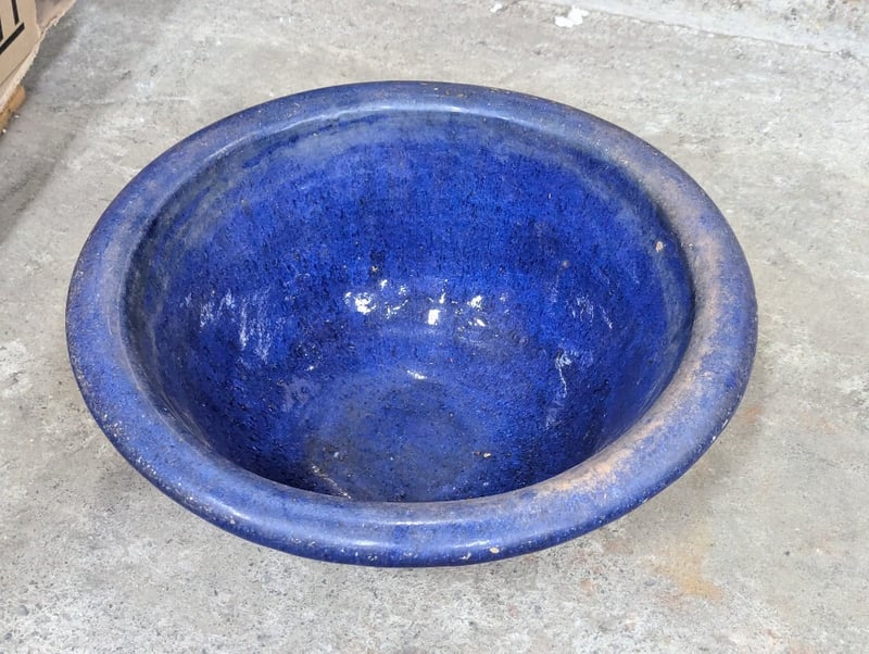 Large blue ceramic bowl featuring a deep, rounded basin form with a rolled rim. The piece displays a rich cobalt blue glaze with visible wear patterns and golden-hued surface marks consistent with age and use. The interior shows distinctive vertical striations or decorative markings. The bowl exhibits a substantial, sturdy construction typical of traditional pottery workDimensions: 20cm h x 47cm w
