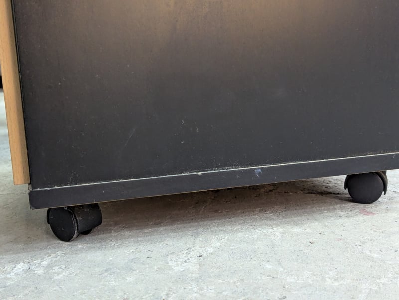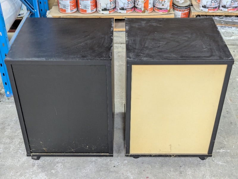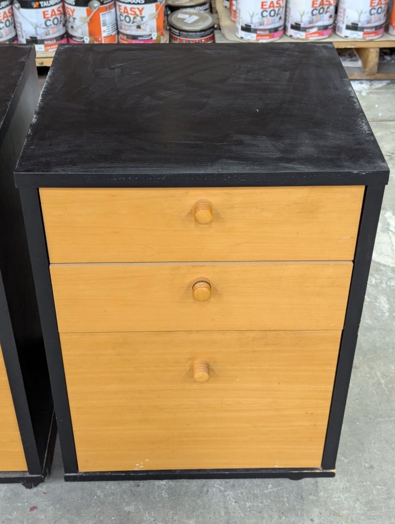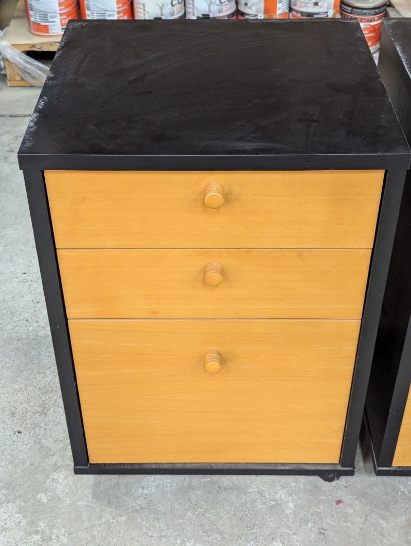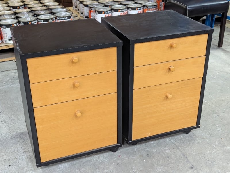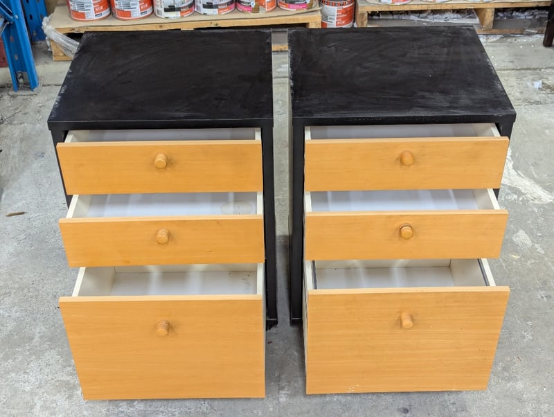 Two bedside tables with drawers, timber construction, items feature three drawers each, on casters