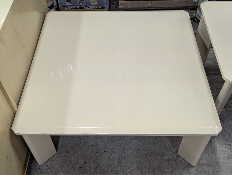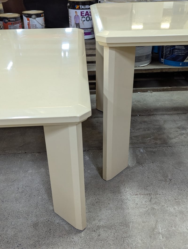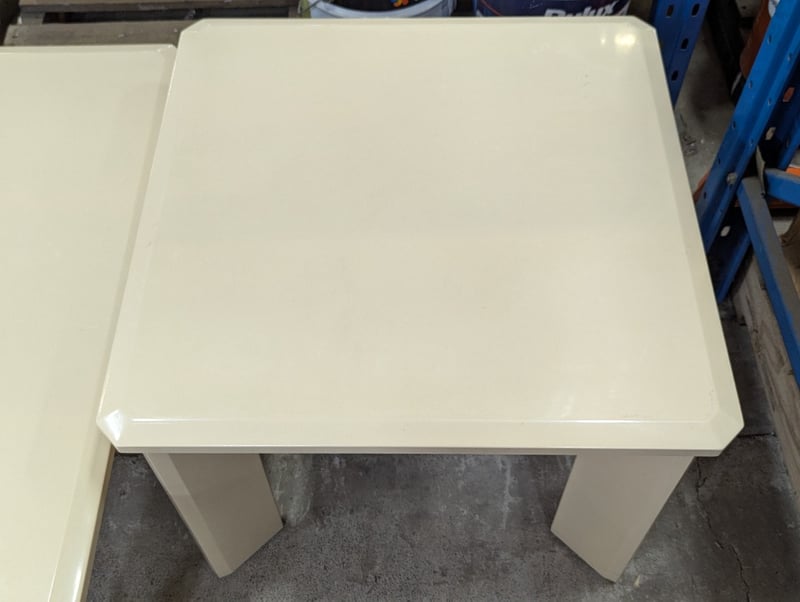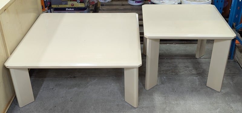 Coffee table and occasional table, timber construction, cream finish, square shapes, four legsTable dimensions:53cm H x 65cm W41cm H x 95cm WSold as lot