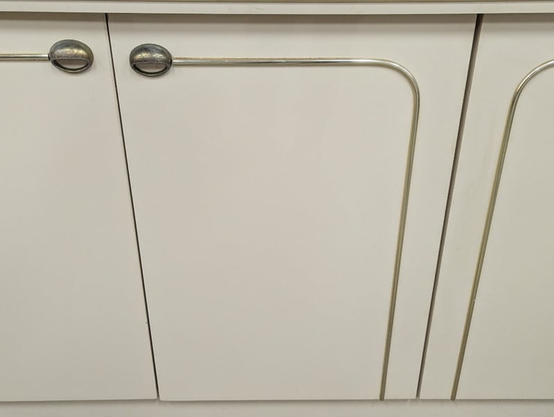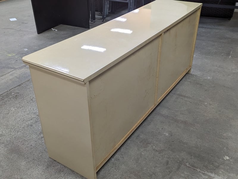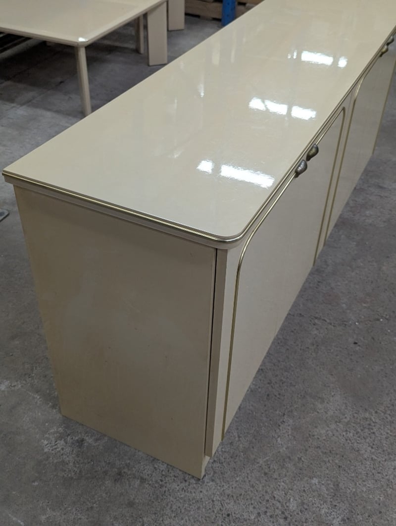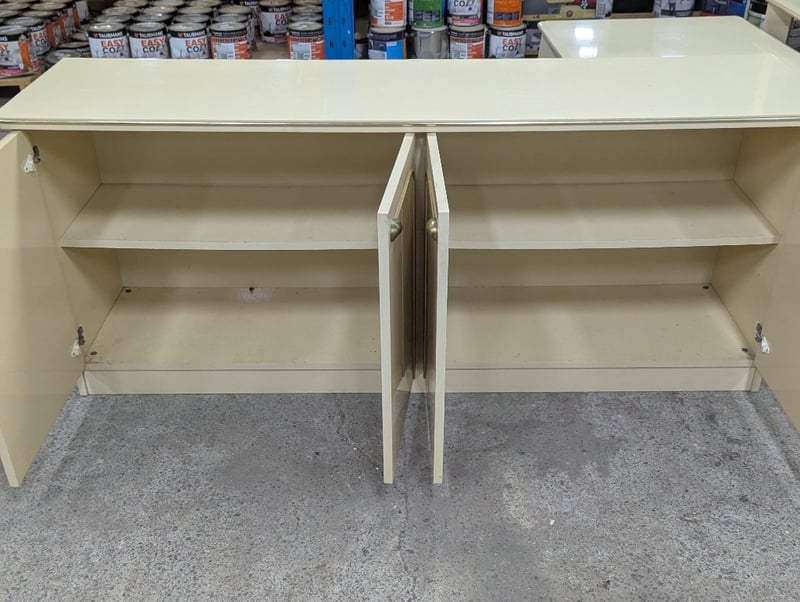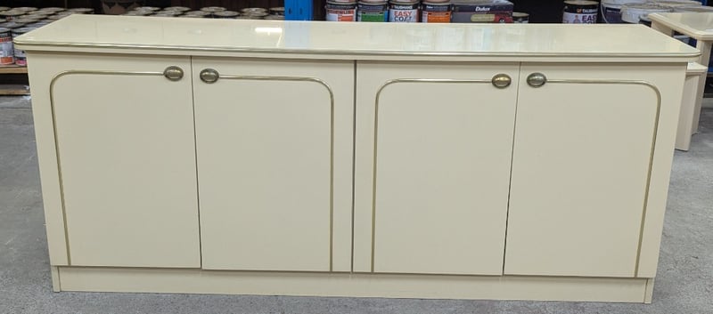 Sideboard, timber construction, cream finish with brass style lining, four doors opening to two interior compartments, compartments feature one shelf, concaved handles Dimensions: 75cm H x 180cm W x 46cm D