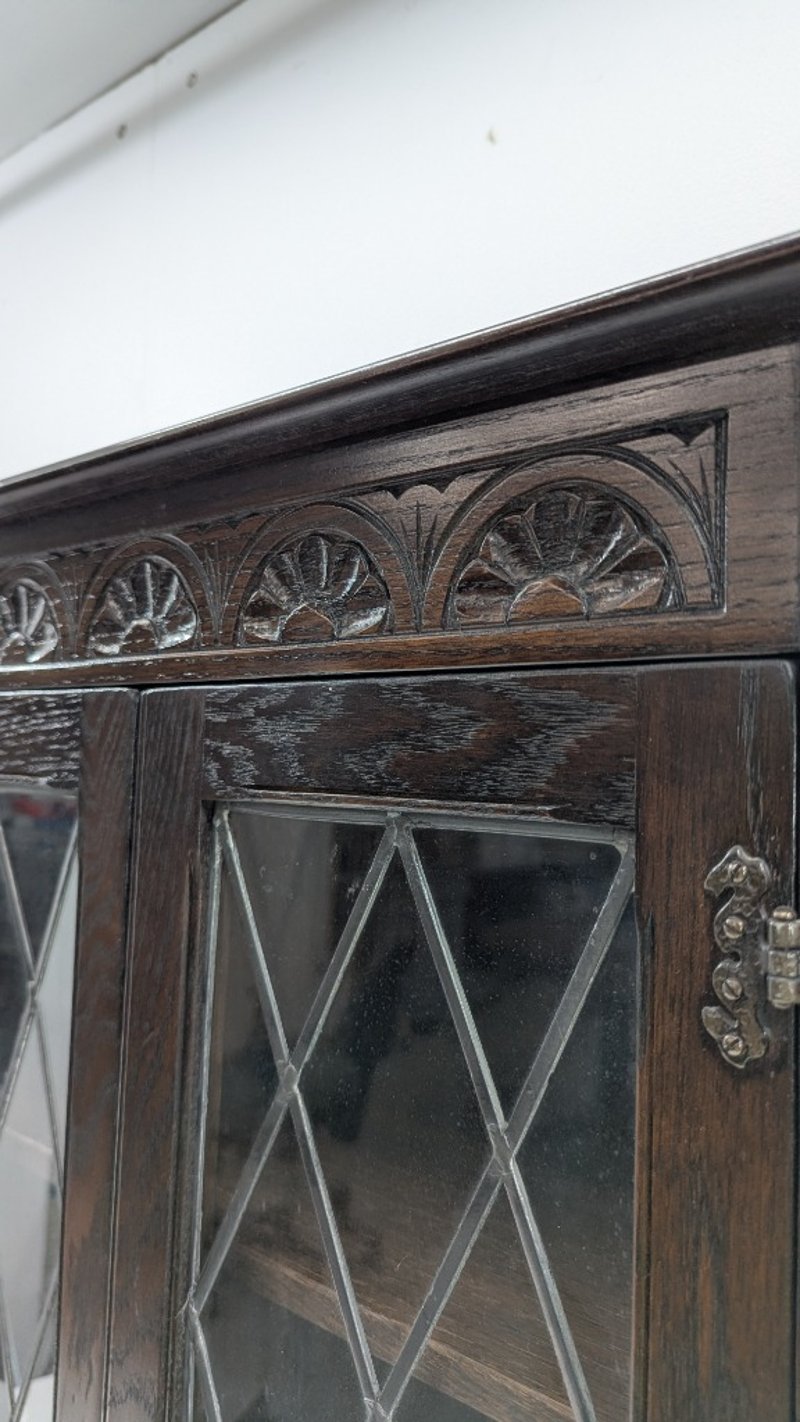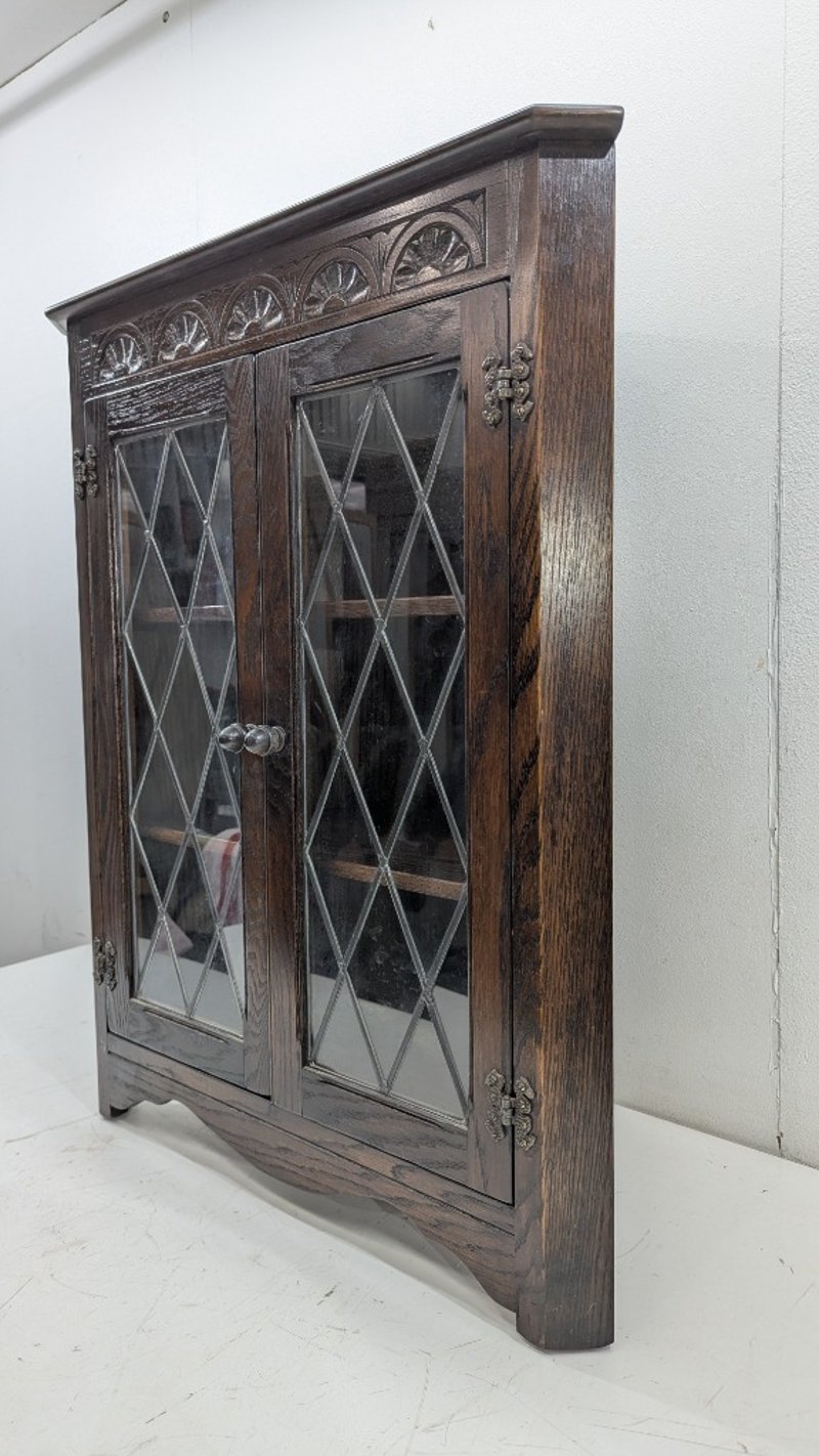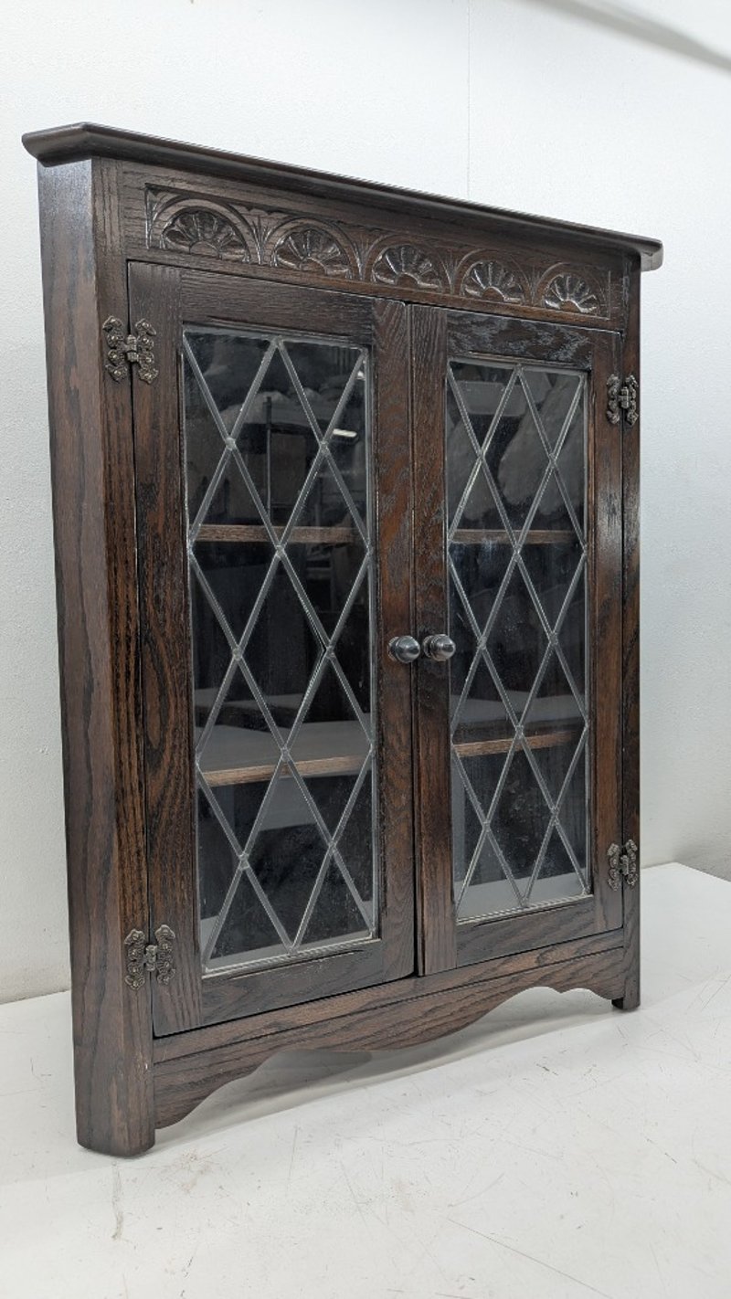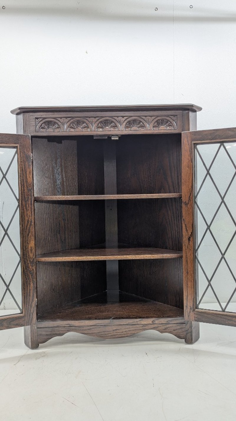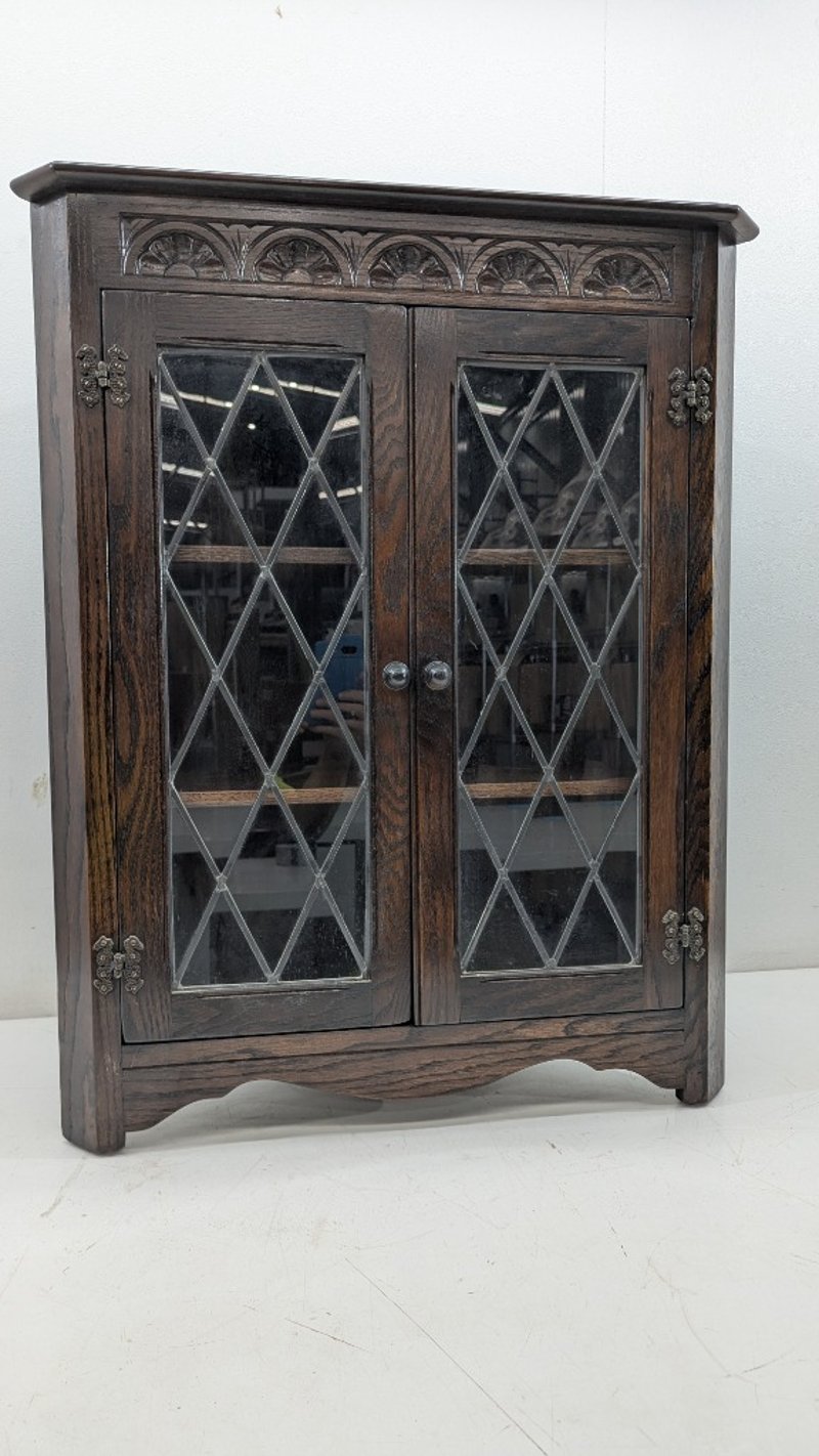 Timber Corner Cabinet, Glass Diamond Display, Three Shelves, Engraved Design, Dimensions:86cm(H)×66cm(W)×38cm(D)