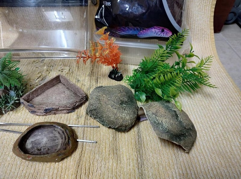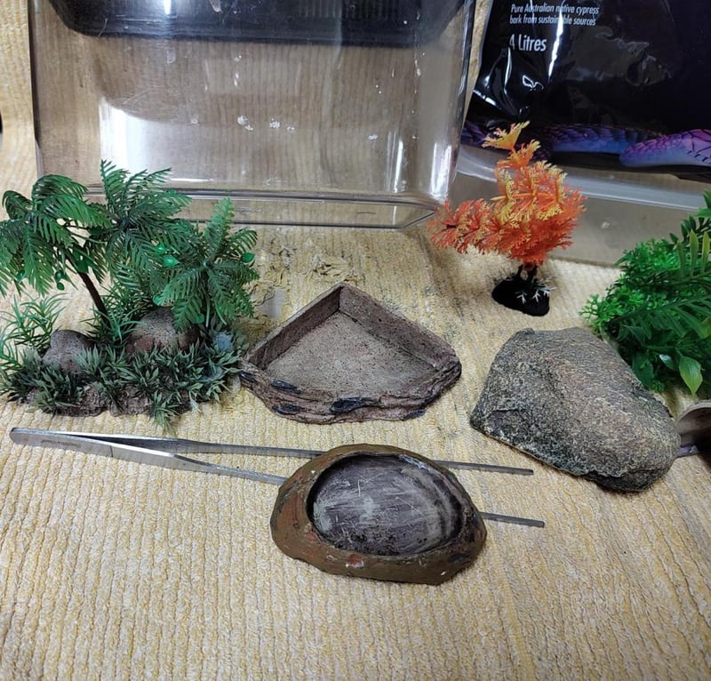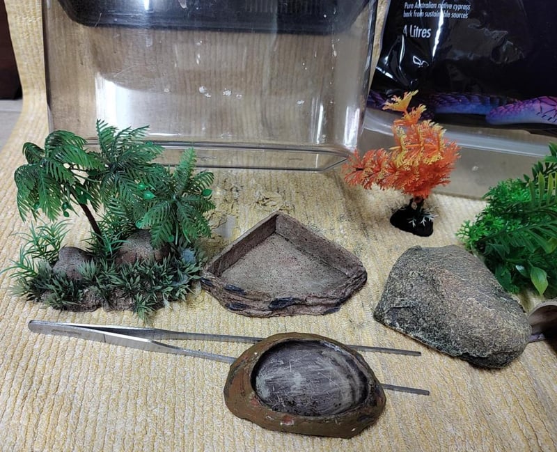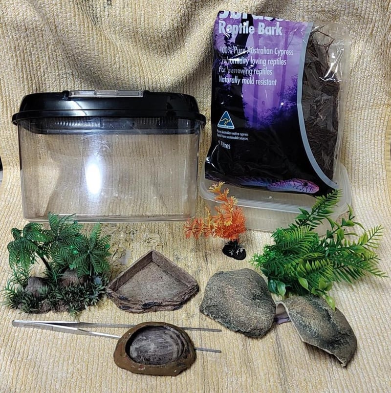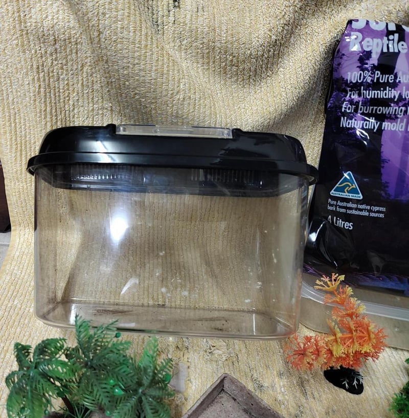 Bundle of pet enclosure gear for Spider or Lizard, medium size plastic tank (25cm x 16cm x 15cm approx), 2 x water bowl, bag of substrate for bottom of tank and various plants