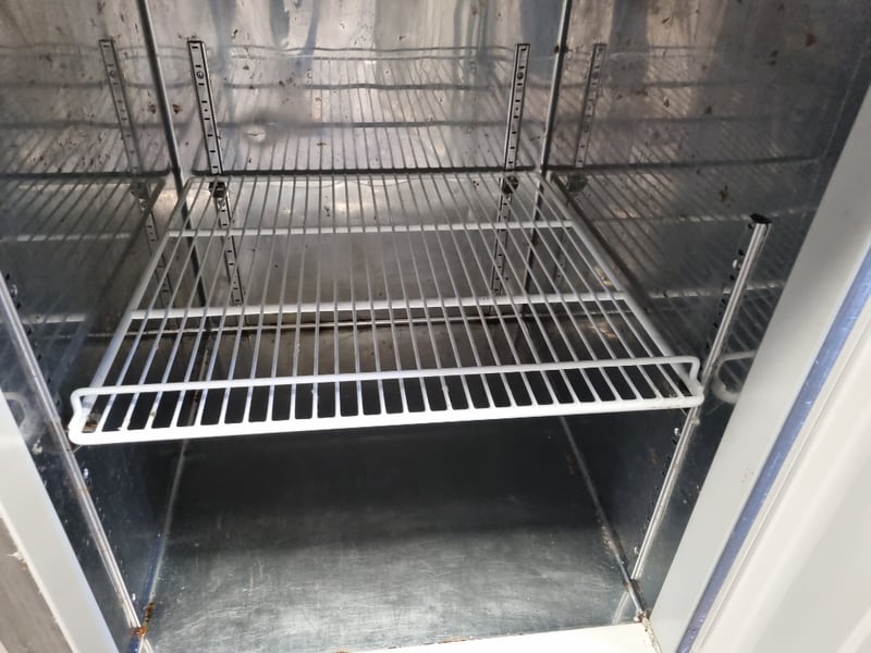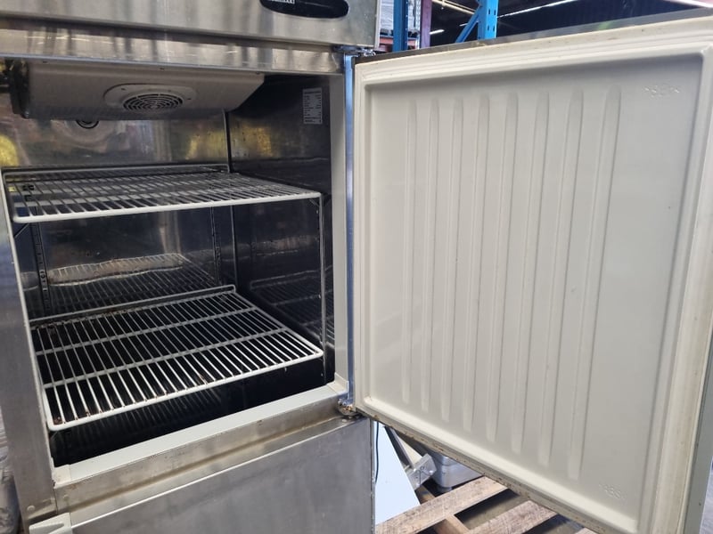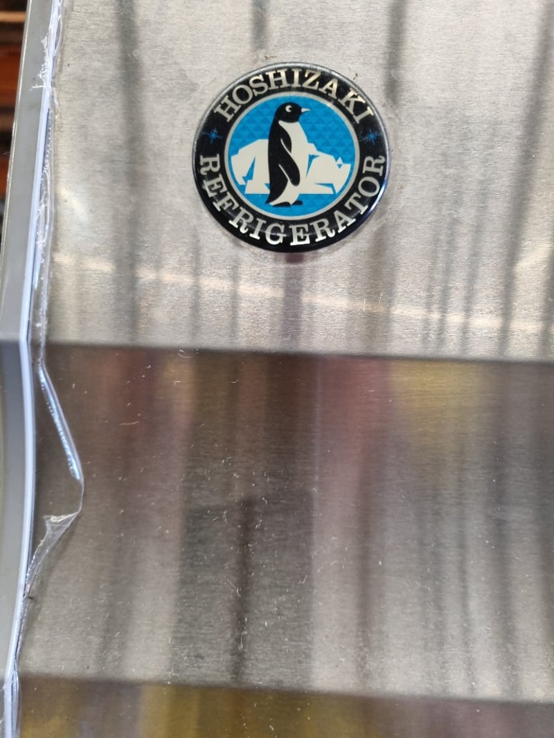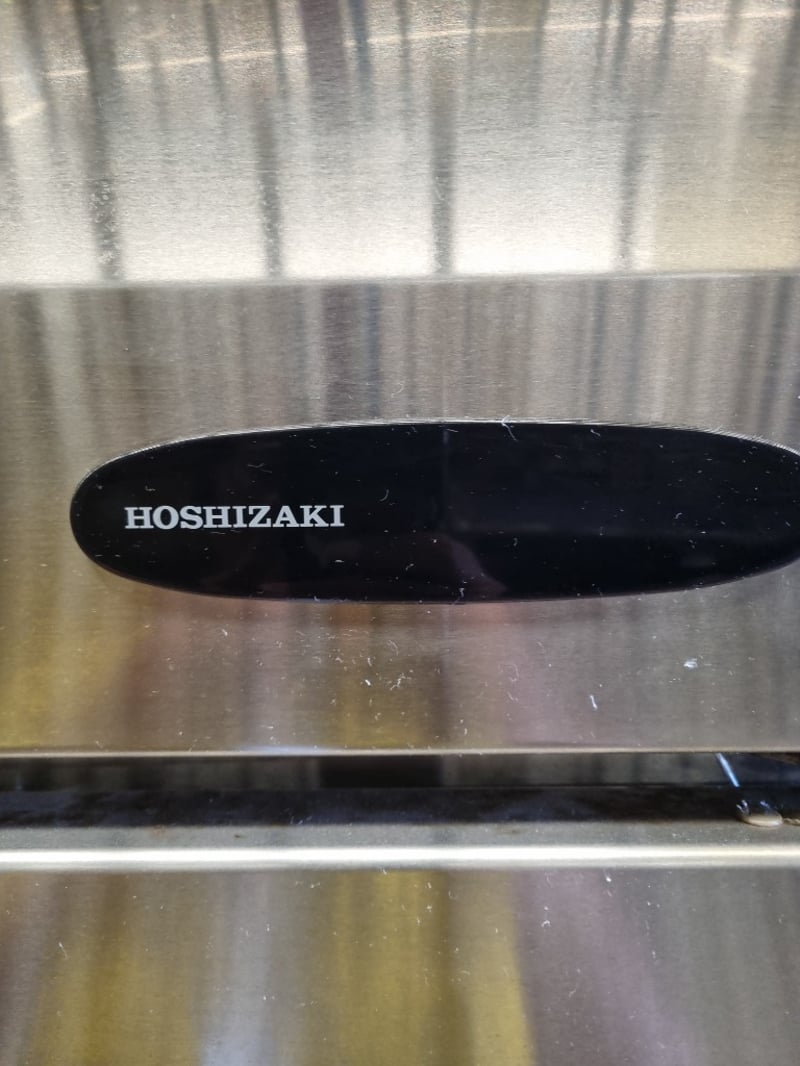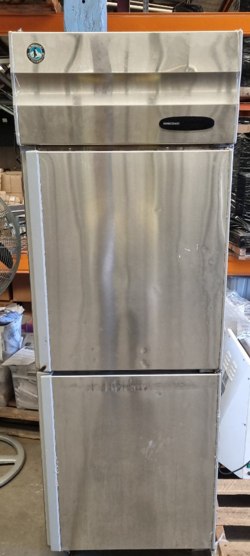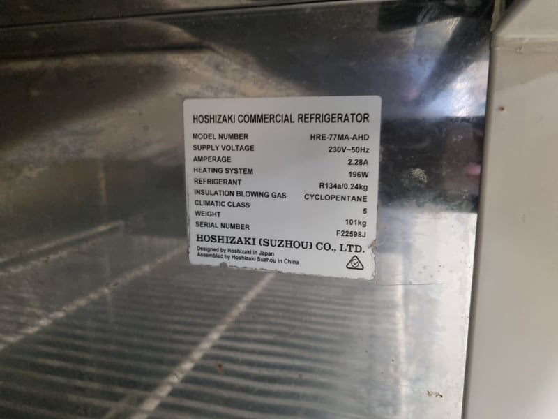 Hoshizaki commercial refrigerator, Model HRE-77MA-AHD. Stainless steel two-door unit with upper freezer compartment and lower refrigerator section. Features solid white interior doors, wire shelving throughout, and top-mounted condenser unit. Equipped with R134a refrigerant system, 196W heating element, and cyclopentane insulation blowing gas. 230V-50Hz supply, 2.28A amperage. Serial number F22598J. Note: signs of wear, untested