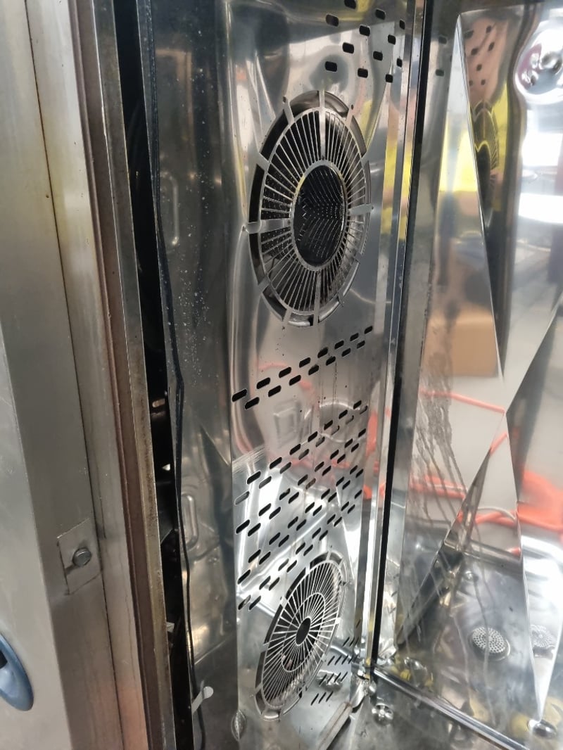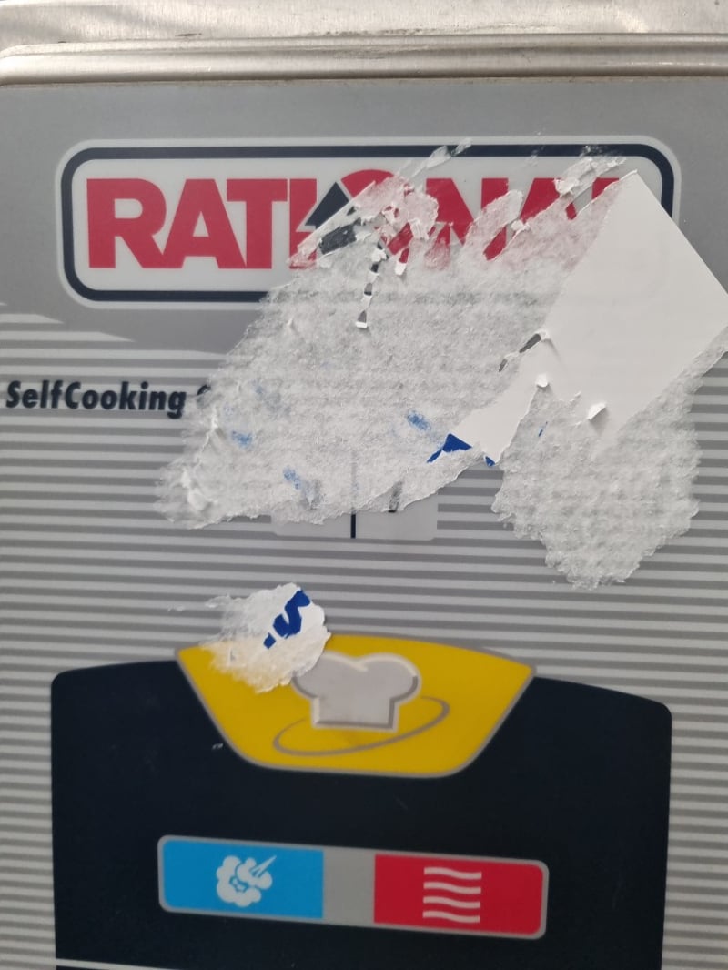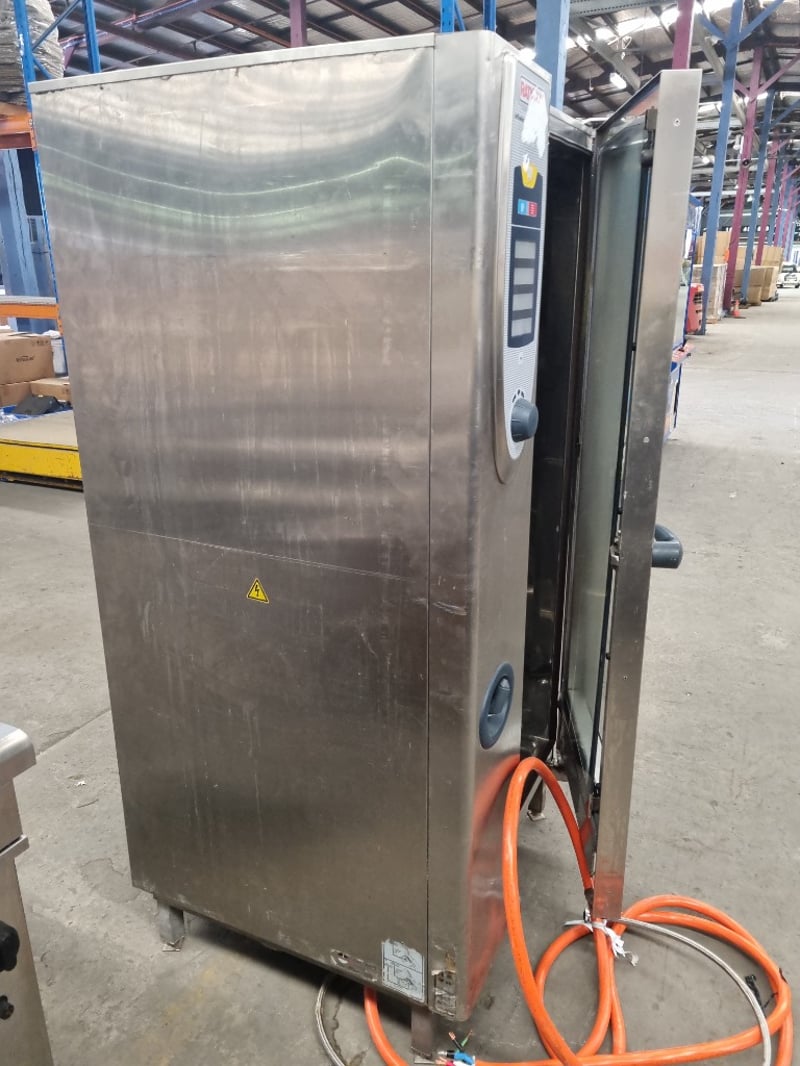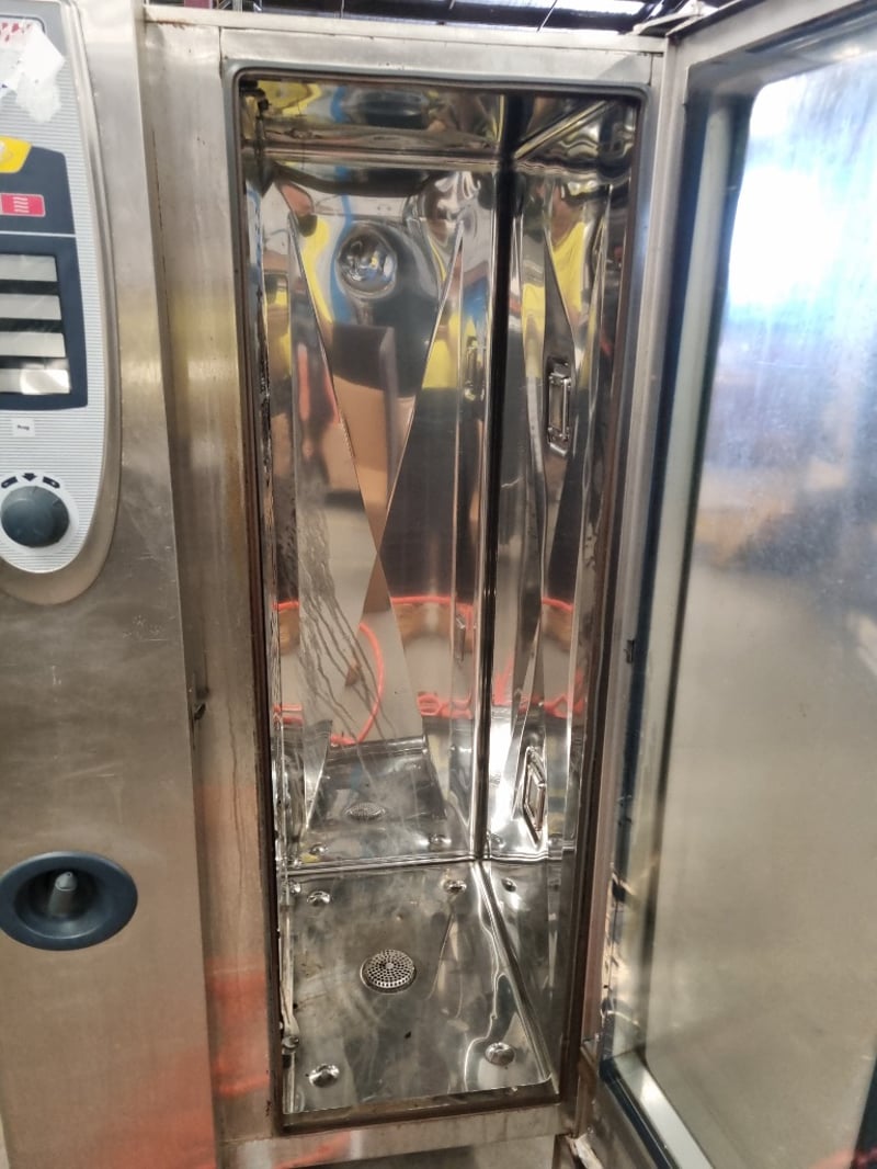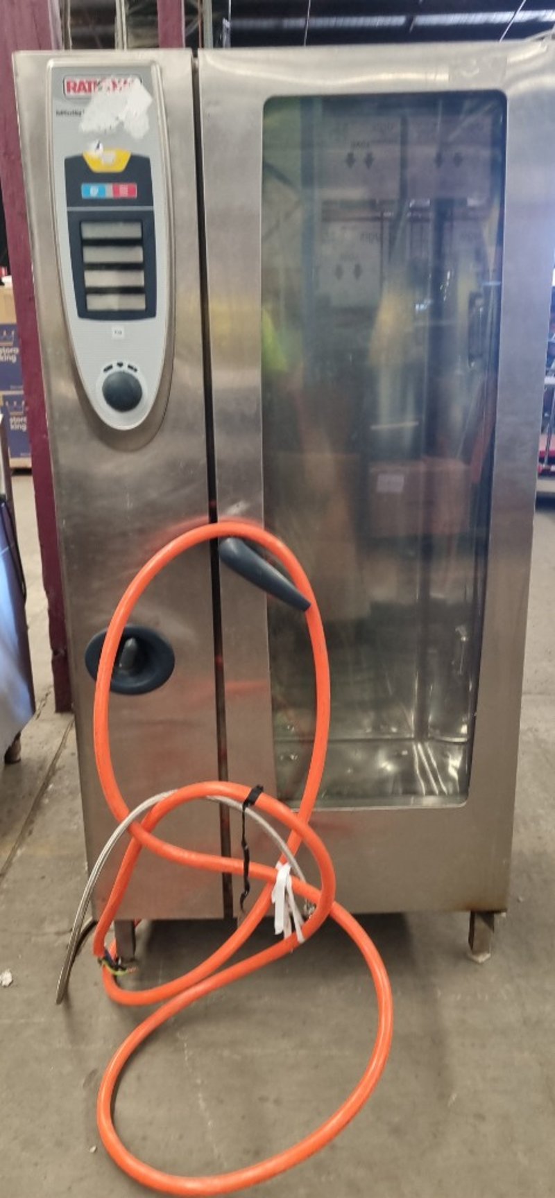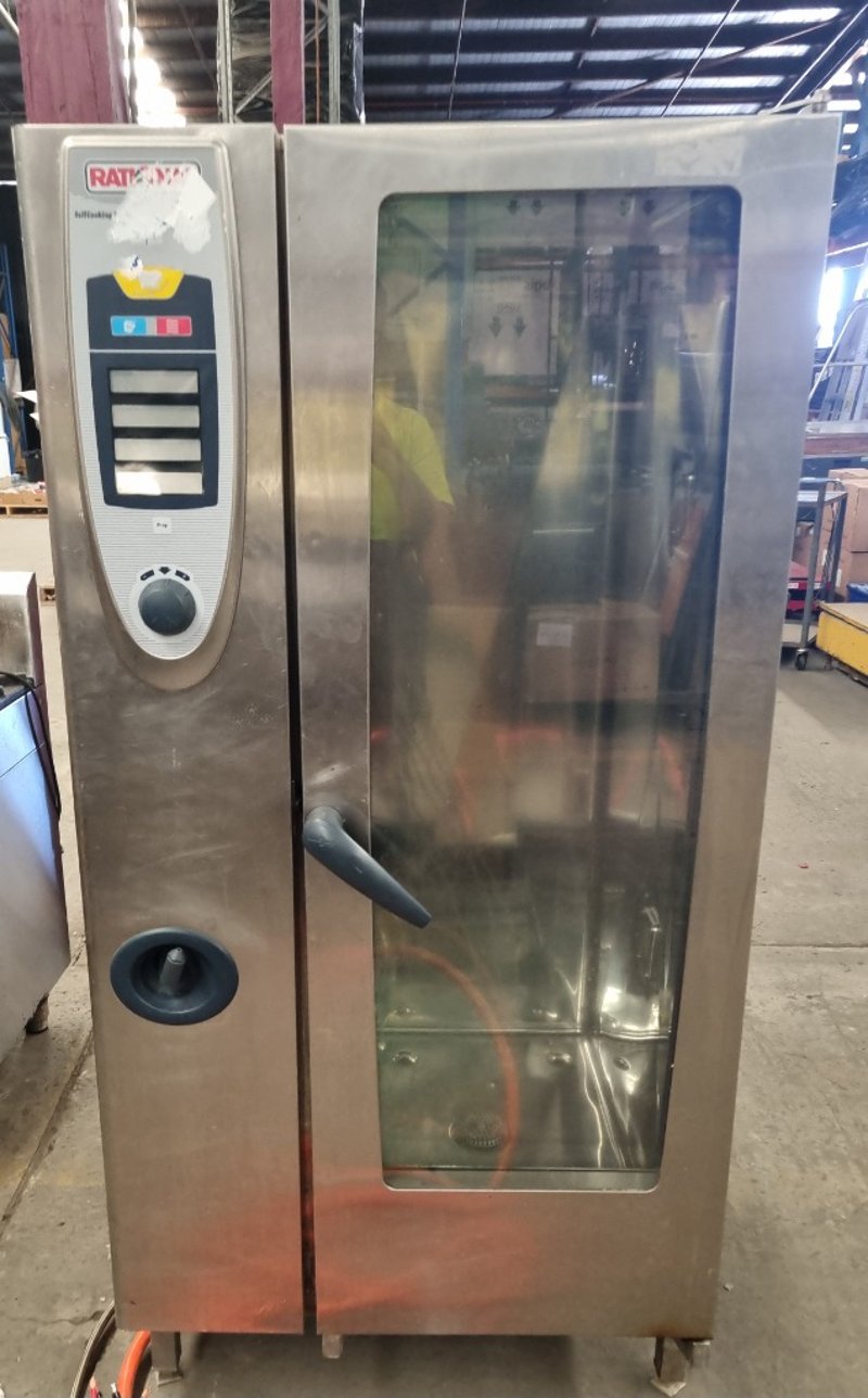 Rational SelfCooking Centre commercial combi oven, stainless steel construction. Features programmable digital control panel with multiple cooking functions. Includes orange power cable with exposed wiring requiring attention. Unit displays signs of age with surface oxidation and patina. Glass door provides visibility of cooking chamber. Equipped with dual heating elements visible through interior venting system. Note: signs of wear, power source replacement required,untested