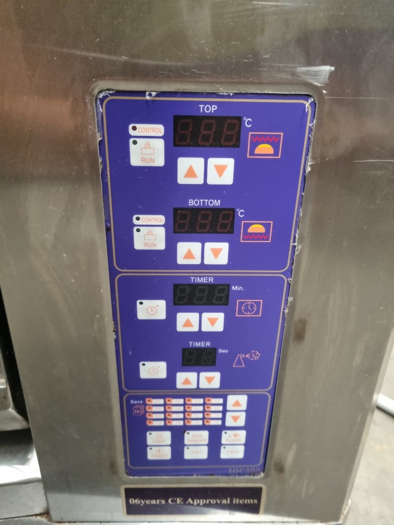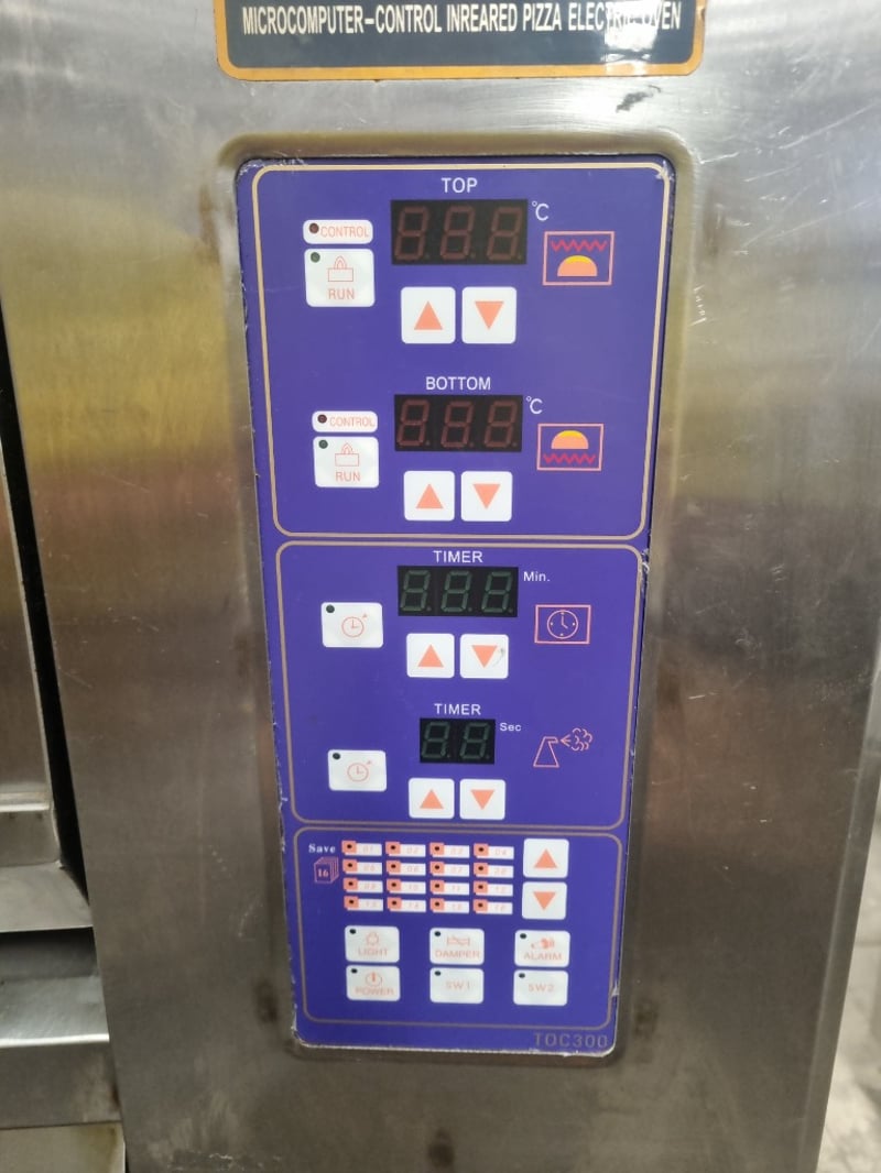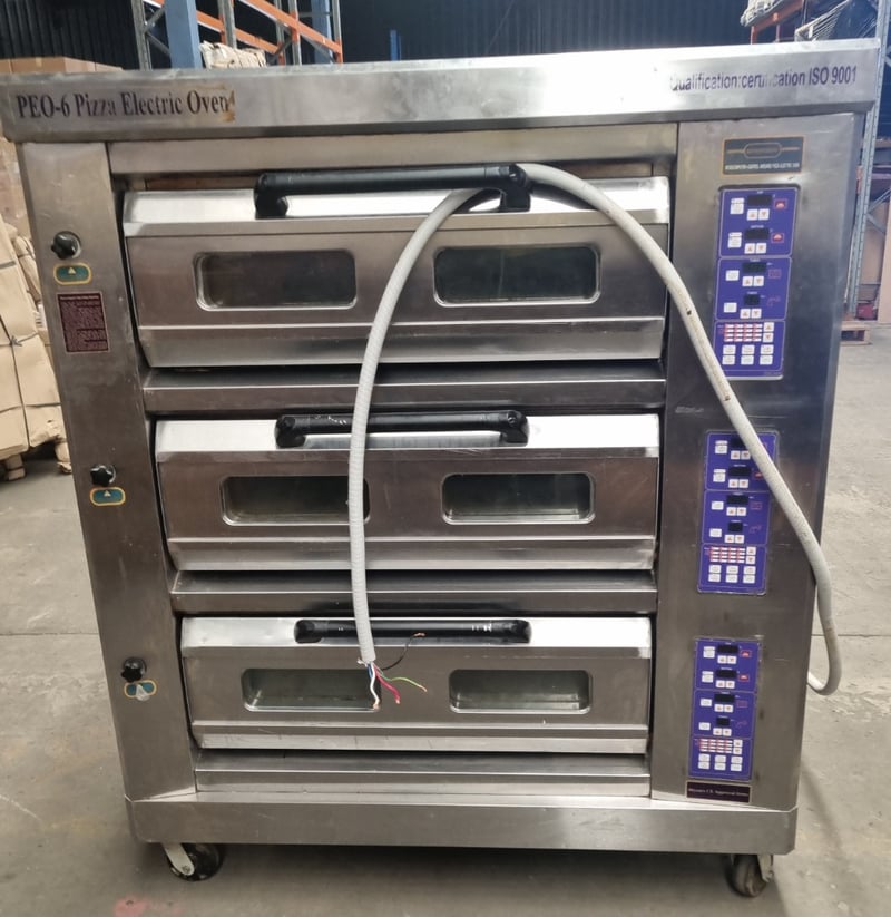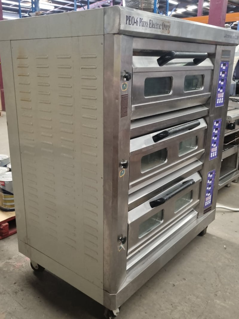 PEO-6 Pizza Electric Oven - Microcomputer-controlled infrared deck oven with 6 cooking chambers. ISO 9001 certified commercial-grade equipment featuring independent top and bottom temperature controls for each deck (displayed in °C). Digital control panel with programmable timer functions (minutes and seconds), temperature adjustment buttons, and preset cooking programs. Equipped with glass viewing windows on all chambers for monitoring baking progress. Stainless steel construction throughout with commercial-grade wheels for mobility. Features separate infill/outfall water connections for steam injection capability. Includes detailed micro-computer data setting operation instructions.