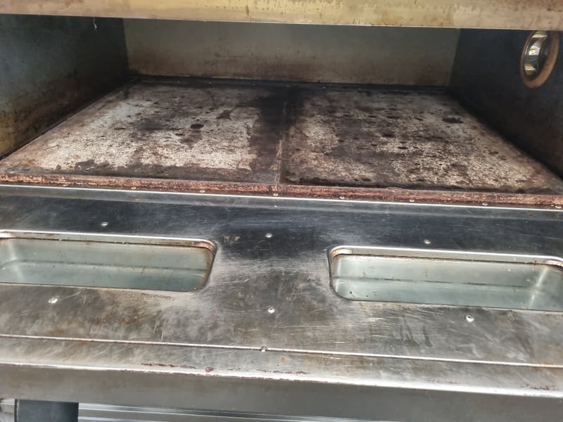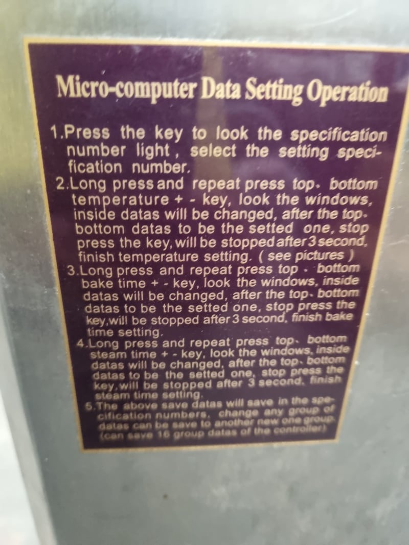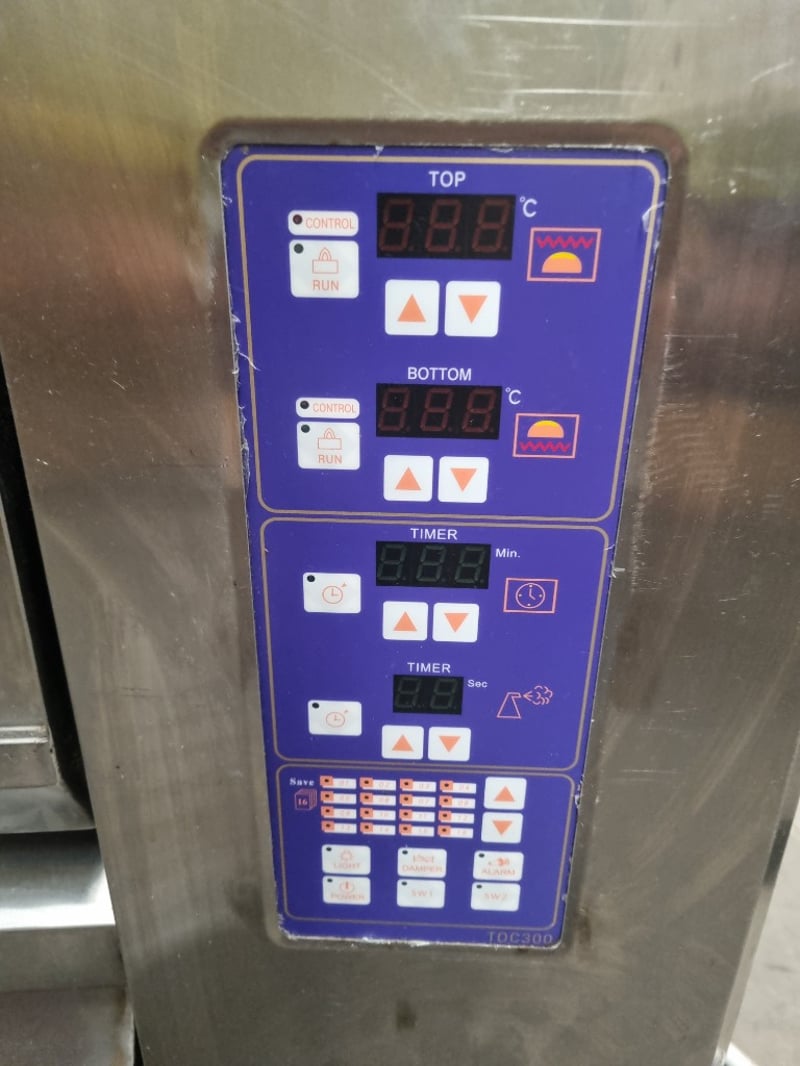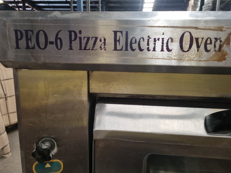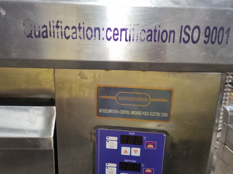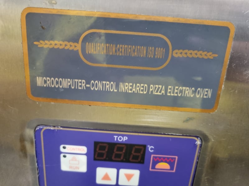 PEO-6 Pizza Electric Oven - Microcomputer-controlled infrared deck oven with 6 cooking chambers. ISO 9001 certified commercial-grade equipment featuring independent top and bottom temperature controls for each deck (displayed in °C). Digital control panel with programmable timer functions (minutes and seconds), temperature adjustment buttons, and preset cooking programs. Equipped with glass viewing windows on all chambers for monitoring baking progress. Stainless steel construction throughout with commercial-grade wheels for mobility. Features separate infill/outfall water connections for steam injection capability. Includes detailed micro-computer data setting operation instructions.