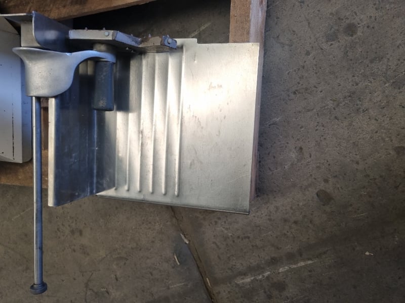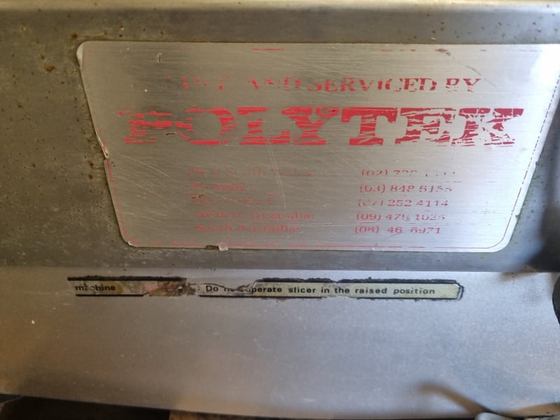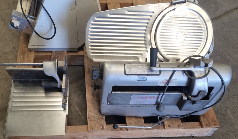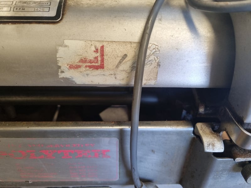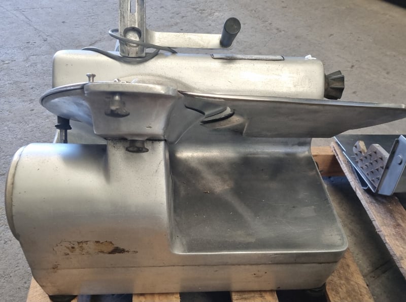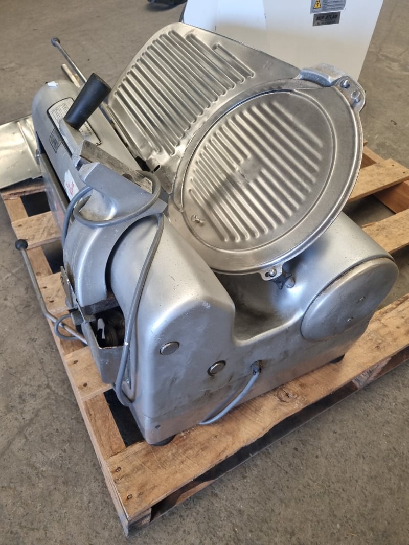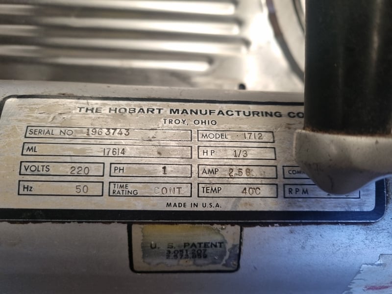 Hobart Model 1712 commercial meat slicer, manufactured by The Hobart Manufacturing Co., Troy, Ohio. Serial number 1963743. Single-phase electric motor (1/3 HP, 220V, 50Hz, 2.5A). Features a large circular slicing blade with adjustable thickness control and manual feed tray.
