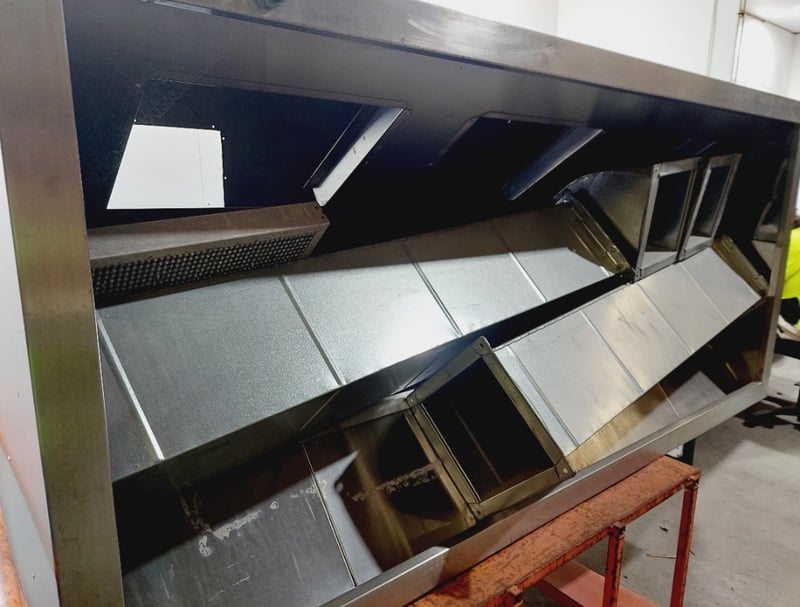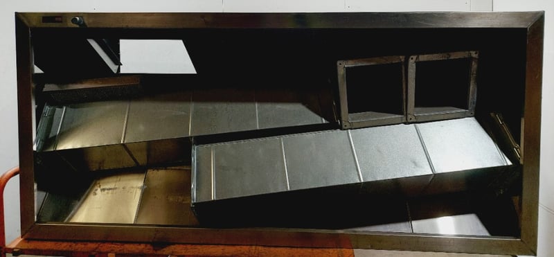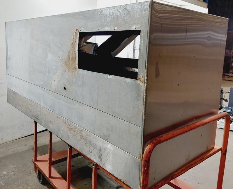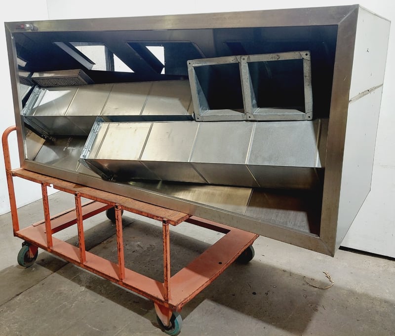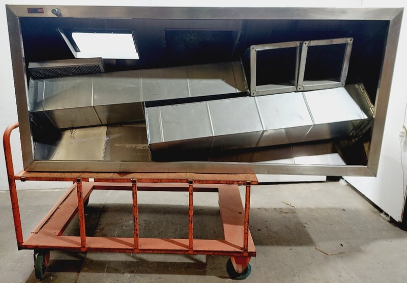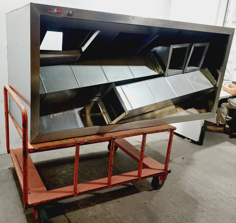 Large Exhaust Vent and components, Trolley, Steel, Silver and Orange Dimensions: Vent: (H)91 x (W)221cm x (D)101cm Trolley: (H)103cm (Handle) x (W)100cm x (D)154cm Sold as lot