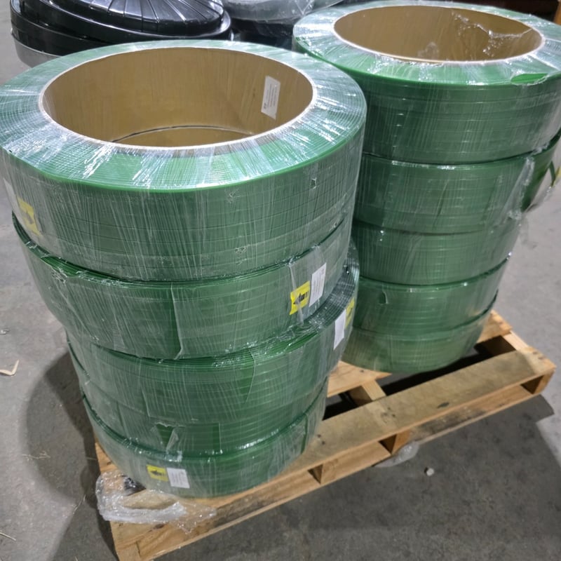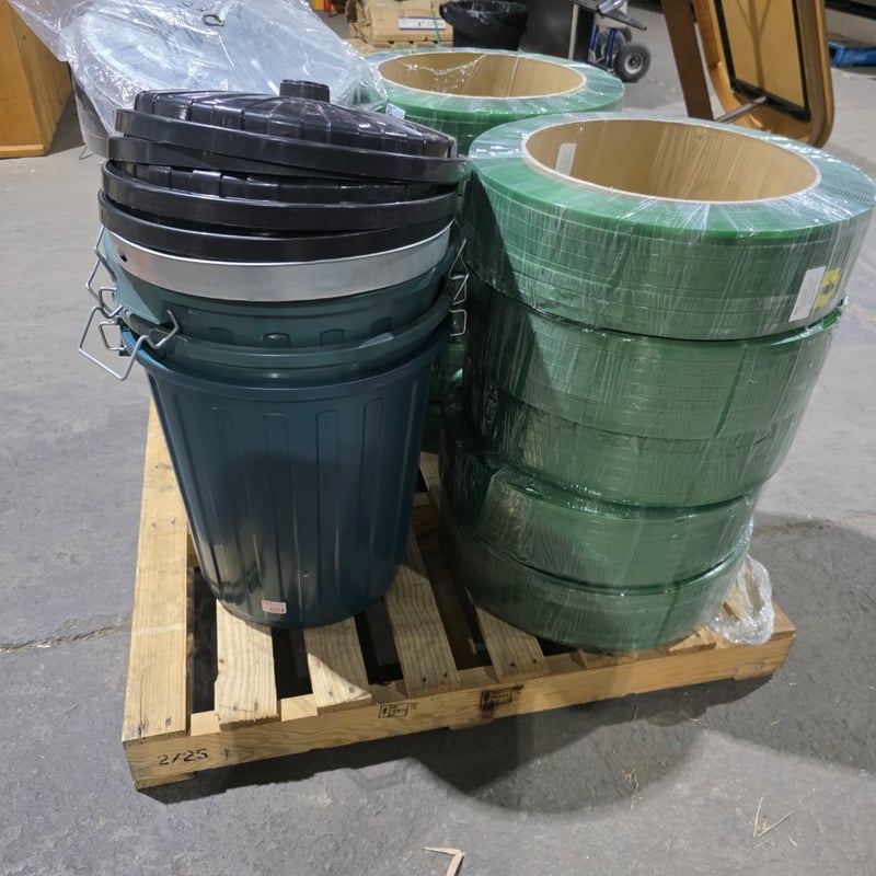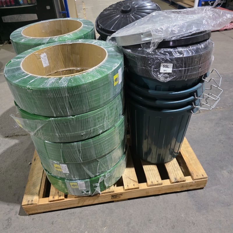 Pallet lot, polyester strapping, garbage bins