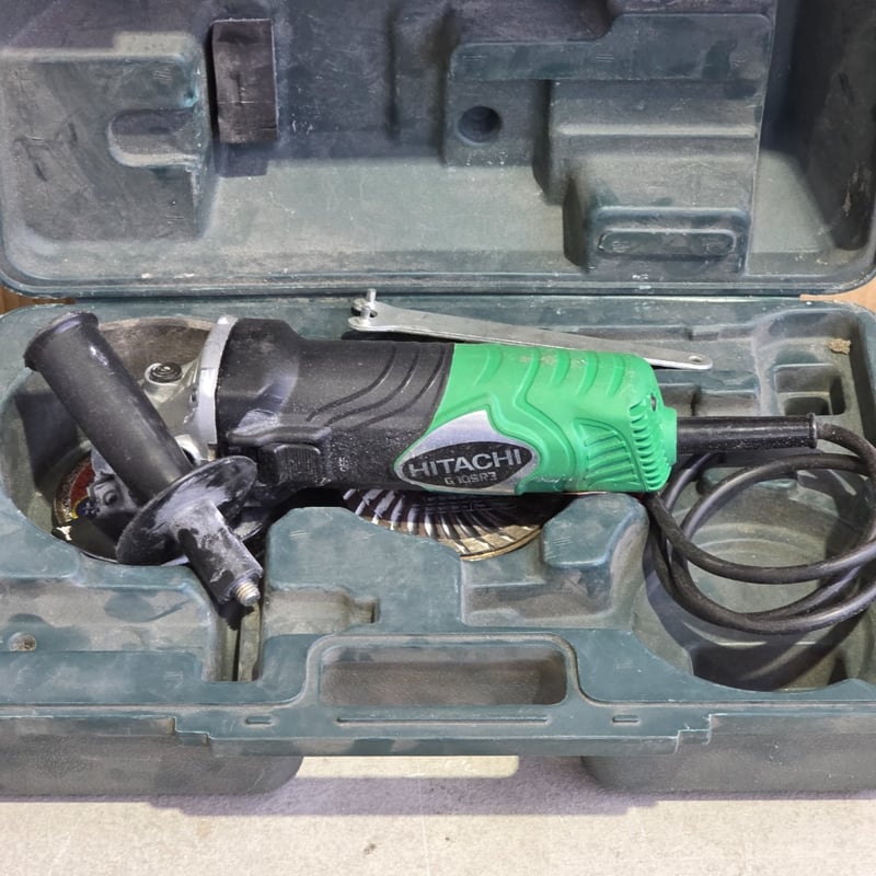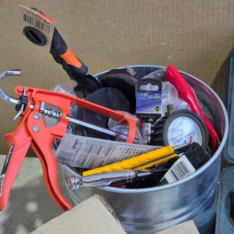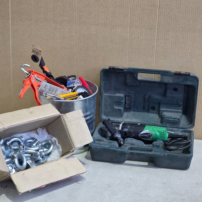 Tools, assorted tools includes Hitachi grinder, eye bolts, silicon gun, tape measure knife and more