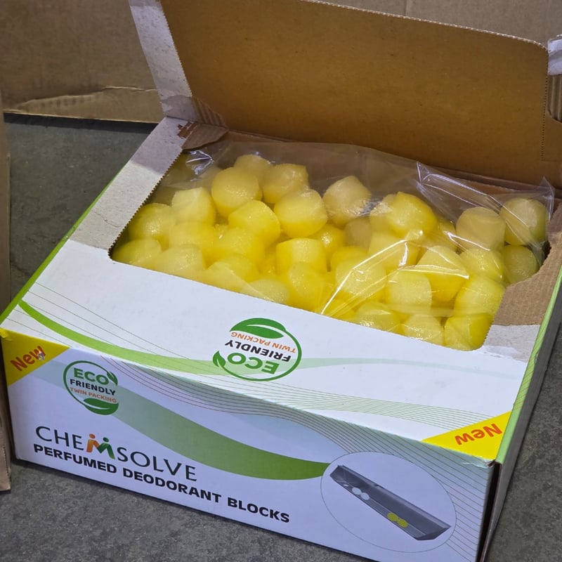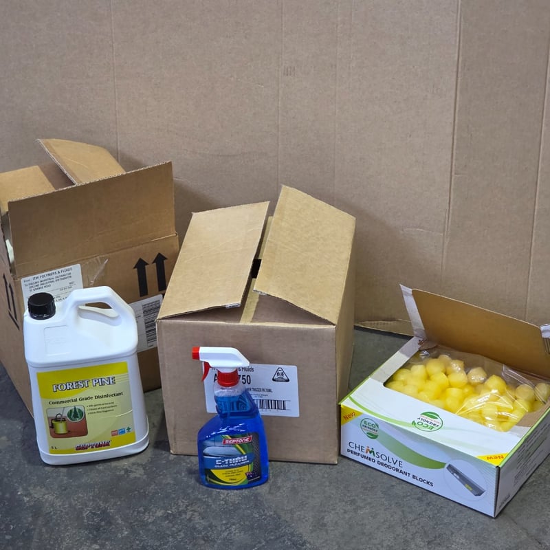 Cleaning products, themselves perfumed deodorant blocks, box of 12 Septone C-thru glass cleaners, box of 4 forest pine commercial grade disinfectantsSold as lot