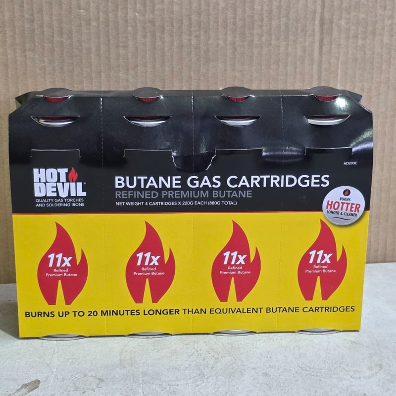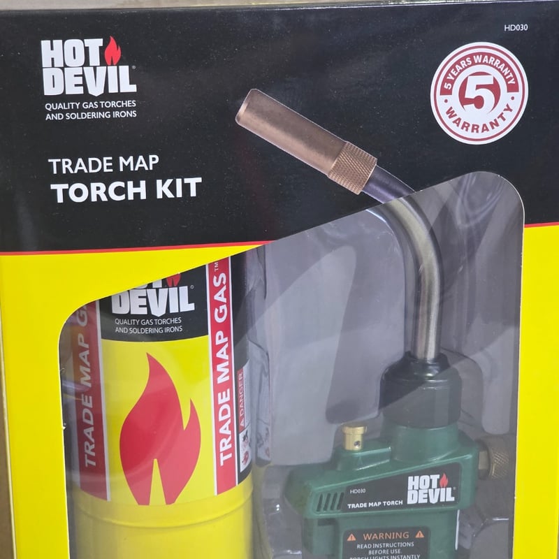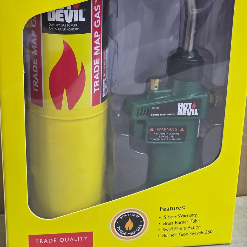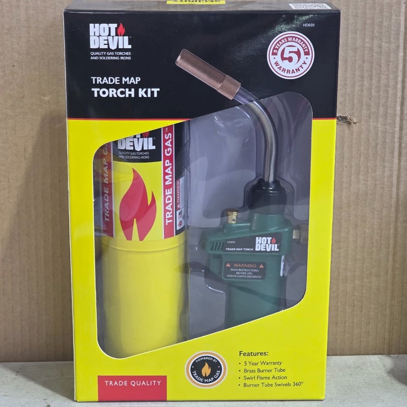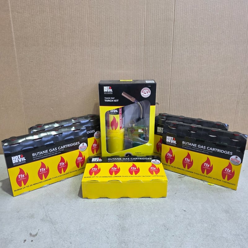 Torch kit and cartridges, Hot Devil trade map torch kit including 20 butane gas cartridges