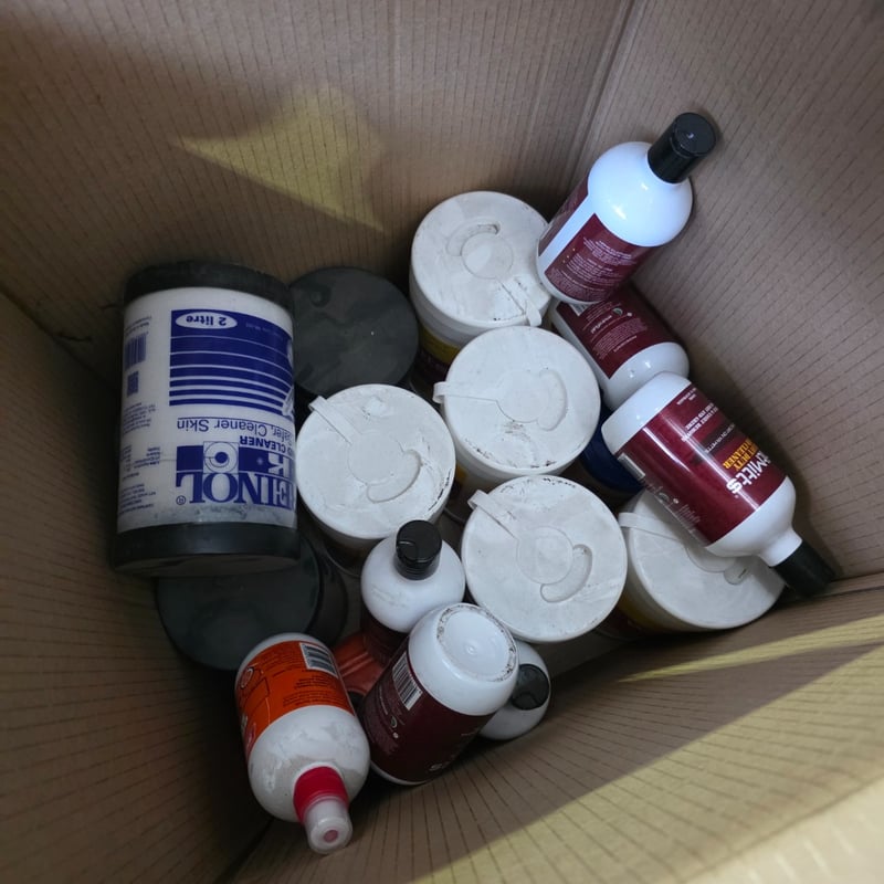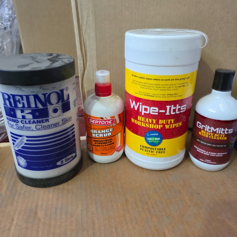 Cleaning supplies, grit hand cleaner, orange scrub, heavy duty wipes, reinol hand cleaner Sold as lot