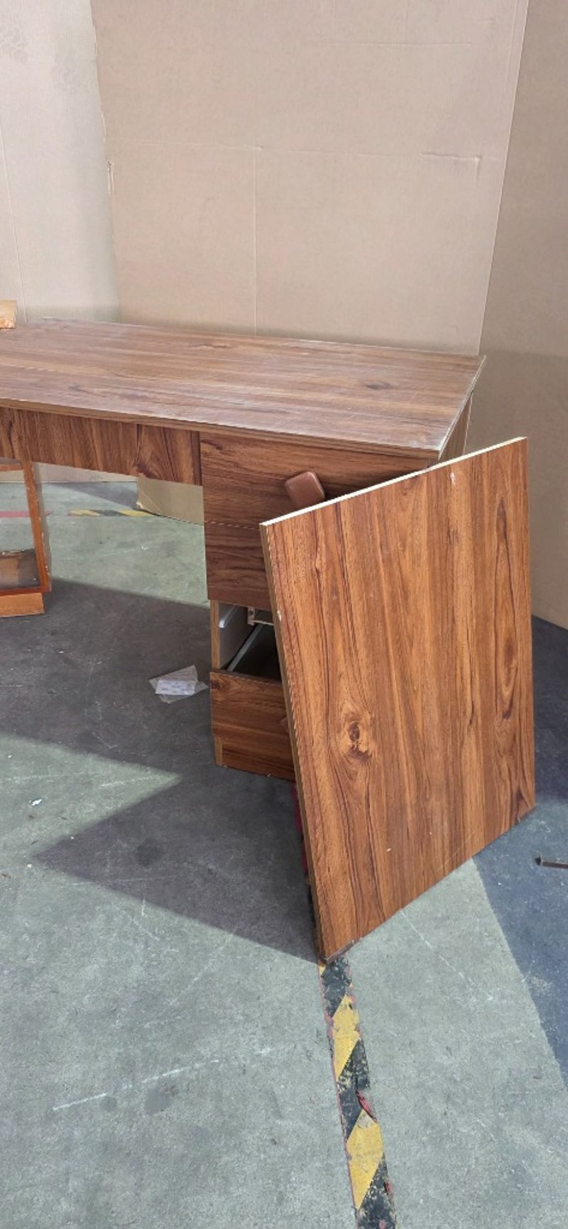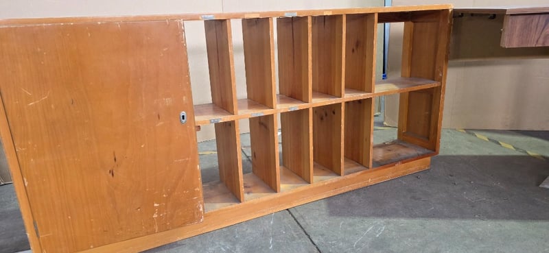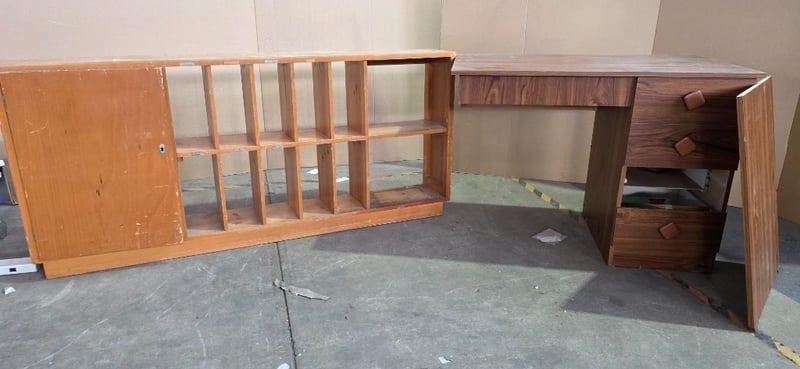 Office furniture, record cabinet and small office desk Note: desk damaged, inspection recommended Sold as lot
