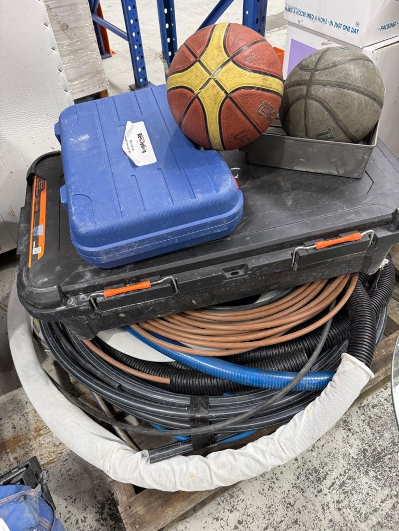 Mixed Industrial Conduit & Tubing, empty tool boxes/ Basketballs, Pallet Lot Assorted sizes and types Sold as lot