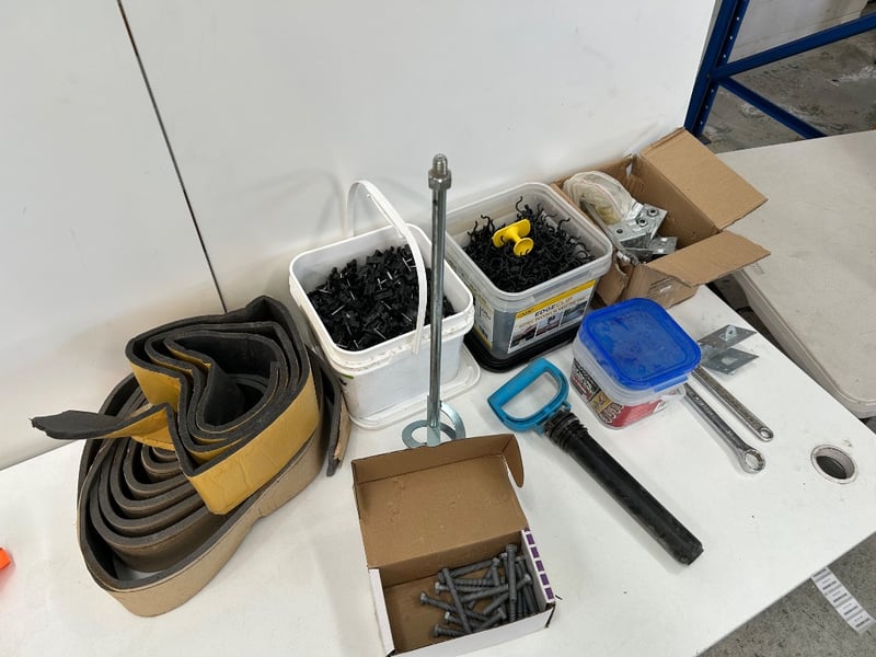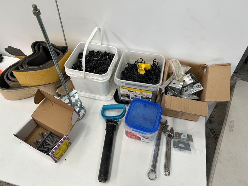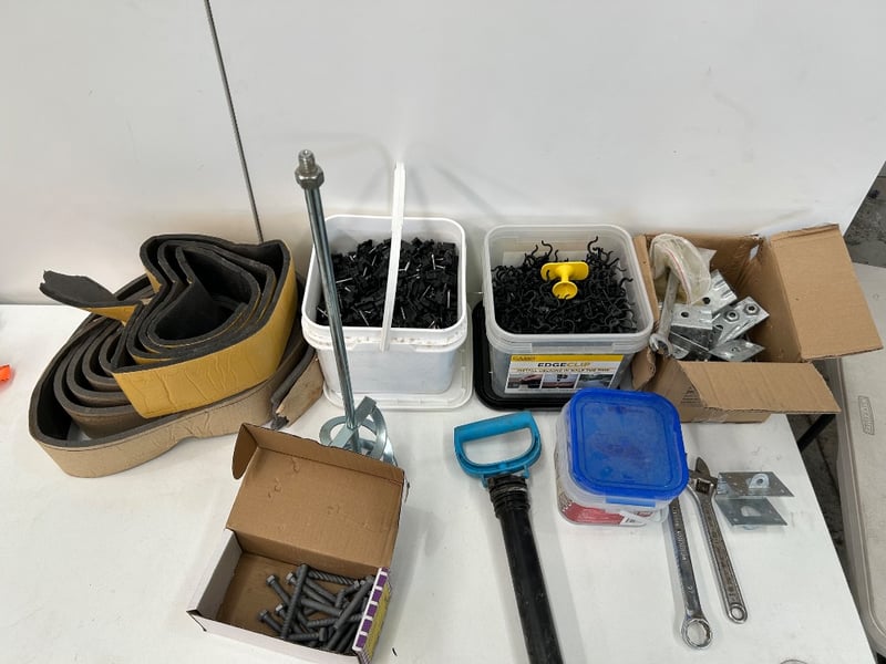 Wrenches, fittings, bolts, metal parts, foam tapes, and more. Sold as lot