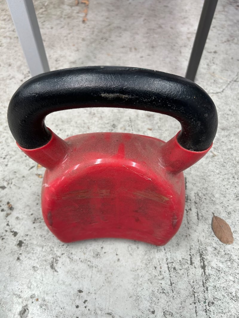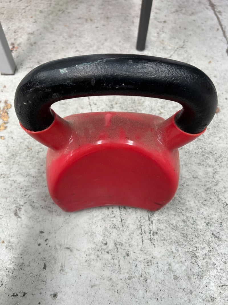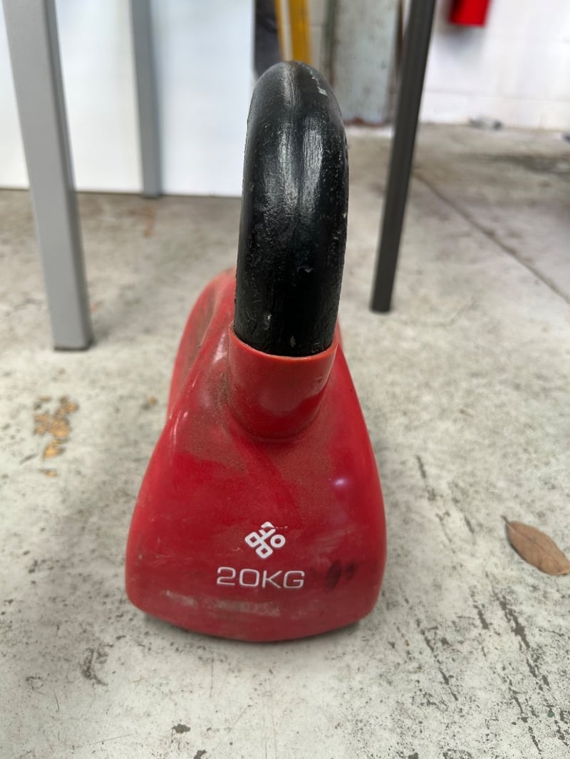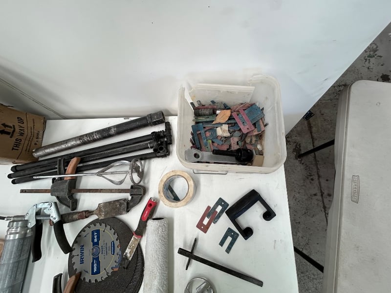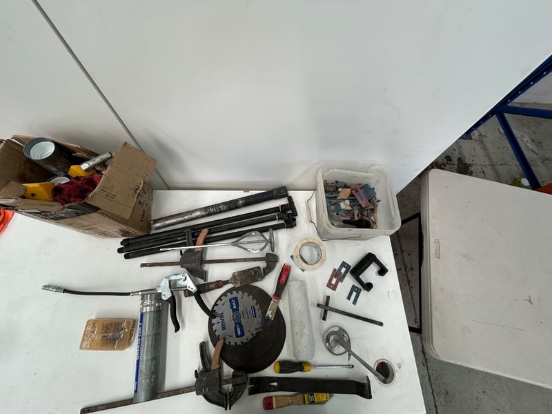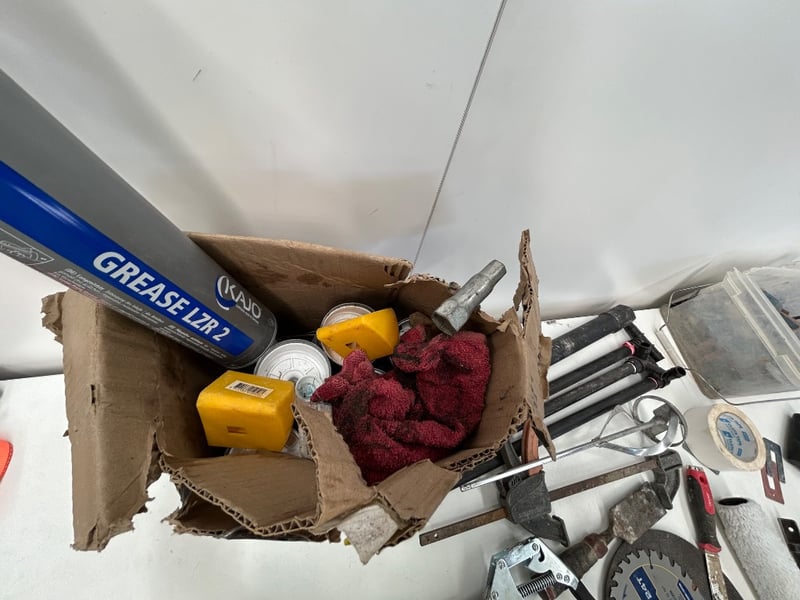 Grease gun, saw blade, metal discs, chisel, fittings, 20KG weight, and more. Sold as lot