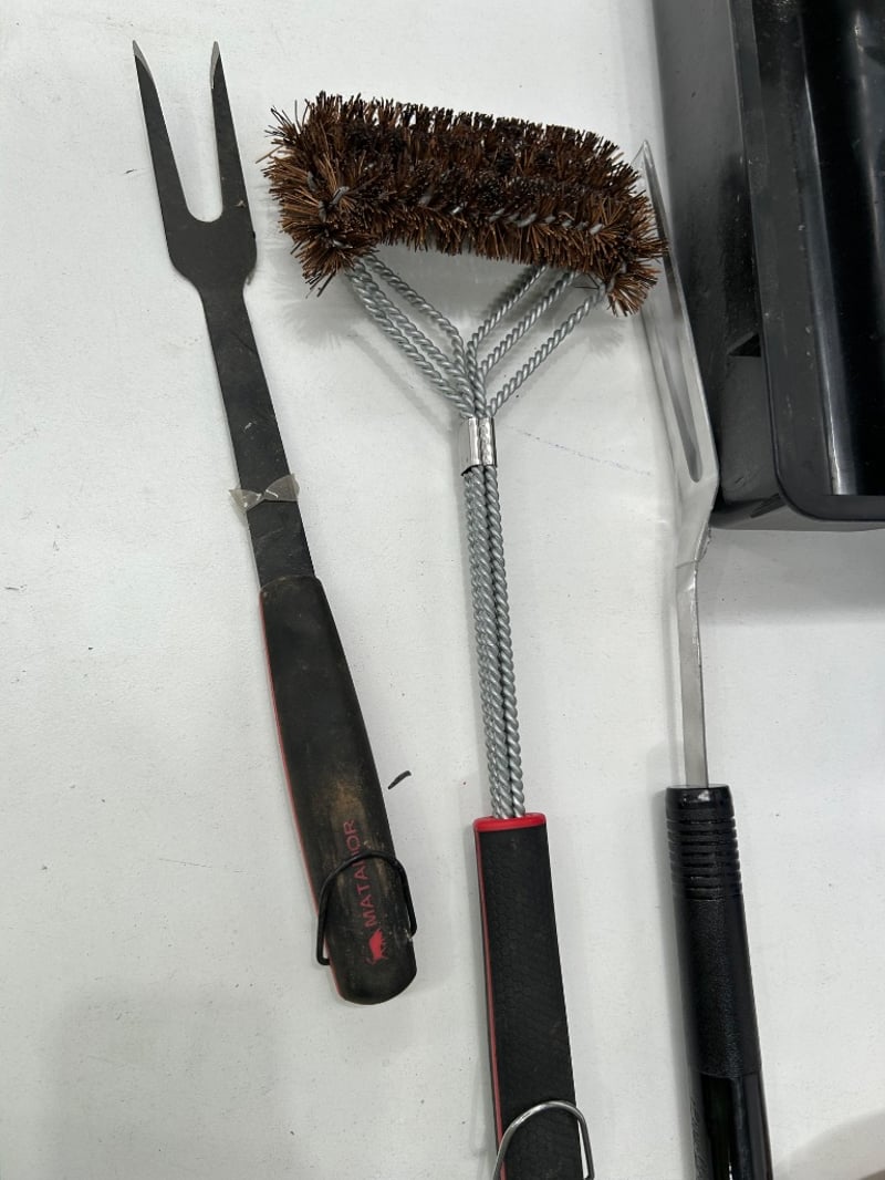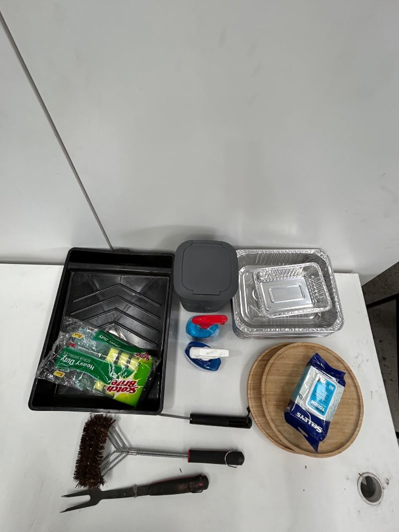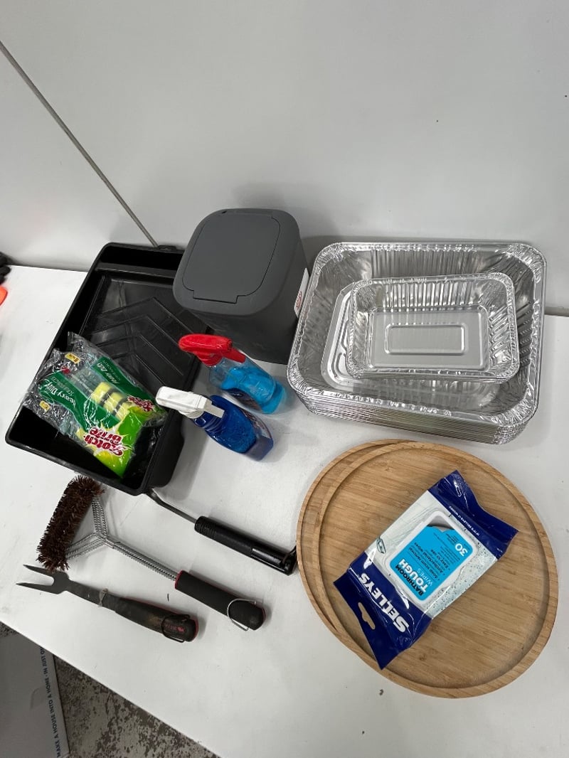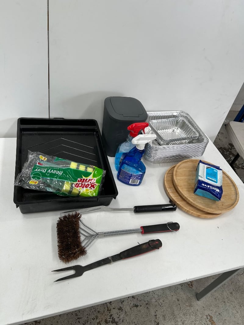 Kitchen ware, disposable trays, cleaning products, small rubbish bin, BBQ utensils and more. Sold as lot