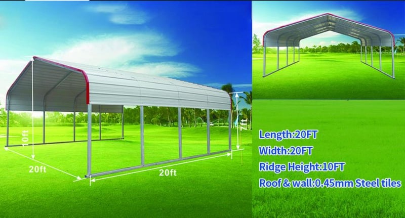 Unused 20ft x 20ft Steel Carport, 20ft Long x 20ft Wide x 10ft High, Approximate Shipping Dimensions : 2220mm L x 1130mm W x 430mm H, Approximate Weight: 550kgLocation: Townsville, QLDStock No. 174580