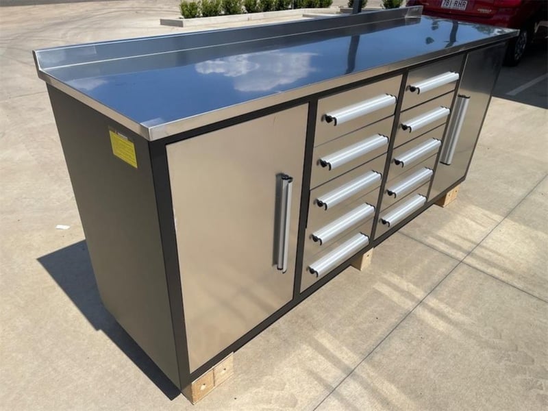 Unused 10 Drawer Stainless Steel Work Bench, Model: 7ft10D-SS, 3 Part Sliding Drawer System, Approximate Shipping Dimensions: 2230mm L x 600mm W x 1100mm H, Approximate Weight: 186kgLocation: Townsville, QLDStock No. S16180