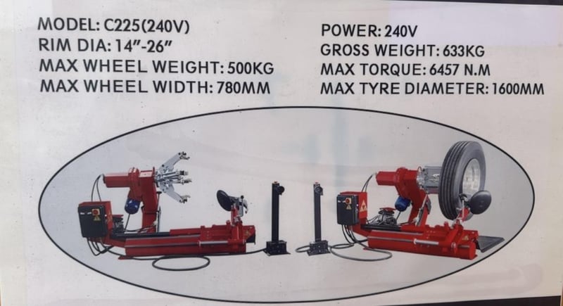 Unused 240V Heavy Duty Truck Tyre Changer, Model: C225, Rim Diameter 14" to 26", Max Wheel weight: 500Kgs, Max Wheel Width 780mm, Max Tyre Diameter - 1600mm, Approximate Shipping Dimensions : 2050mm L x 1570mm W x 850mm H, Approximate Weight: 633kgLocation: Townsville, QLDStock No. 174402