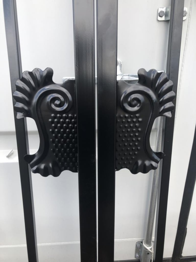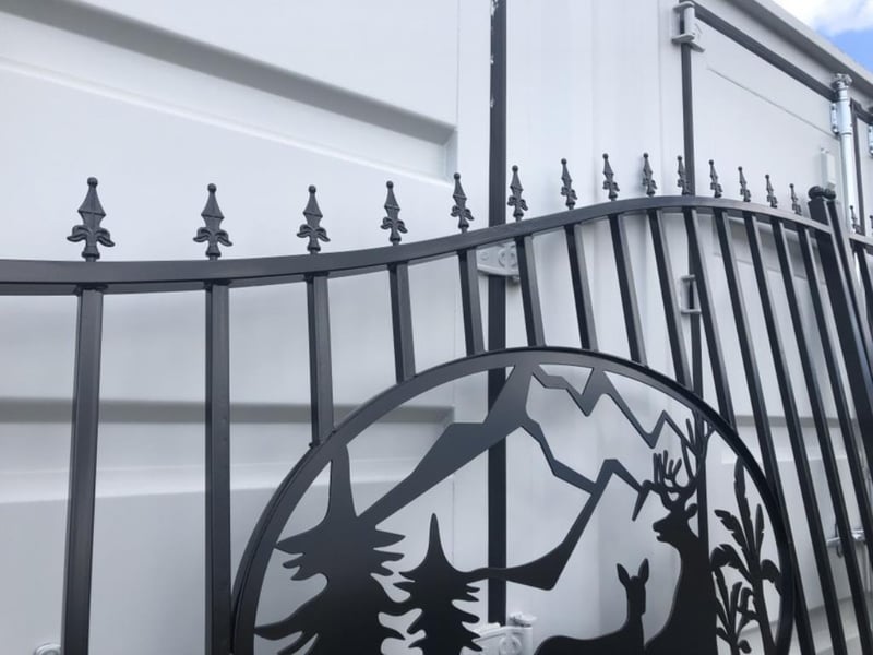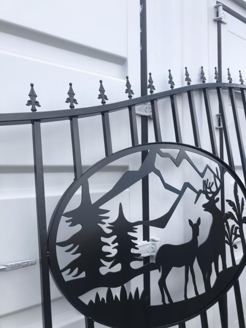 Set of 2 Large Unused Wrought Iron Style Gates with Wildlife Scene, Each gate is 10ft wide, Height at High Side: 2.3m, Height at Low Side: 1.8m, Made from Galvanised Steel, Total Approximate Combined Weight of both gates: 175kg Location: Dubbo, NSW