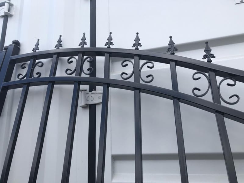 Set of 2 Small Unused Wrought Iron Style Gates with Wildlife Scene, Each gate is 7ft wide, Height at High Side: 2.3m, Height at Low Side: 1.8m, Made from Galvanised Steel, Total Approximate Combined Weight of both gates: 150kg Location: Dubbo, NSW