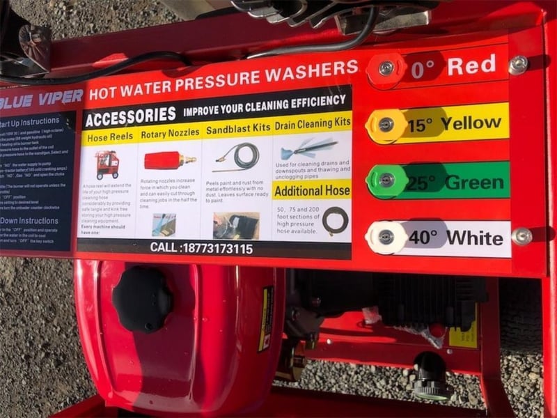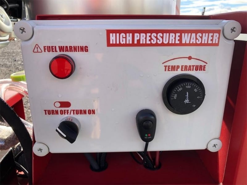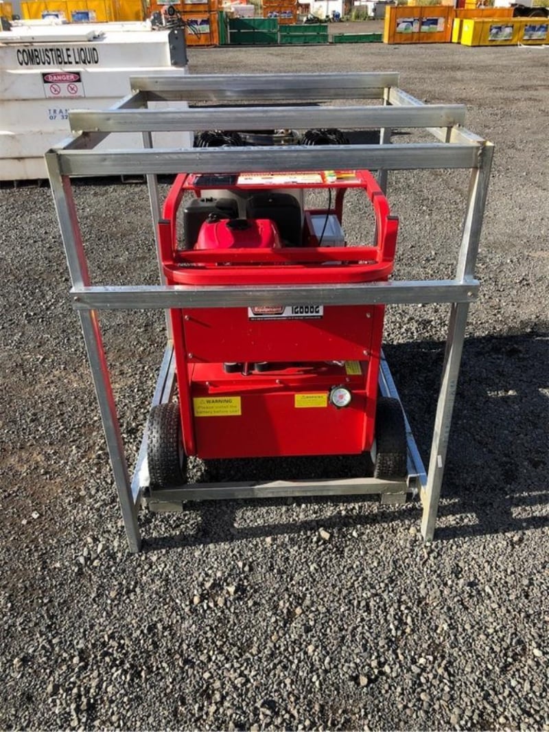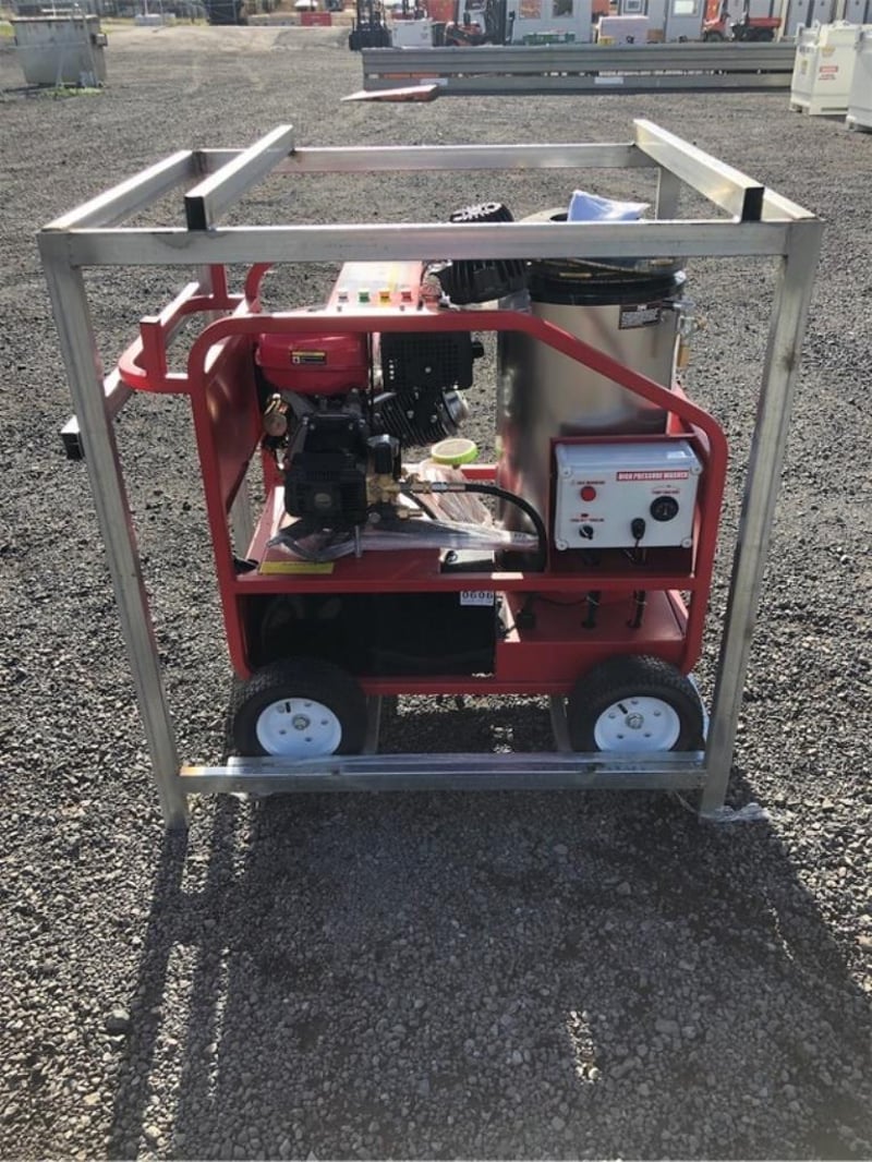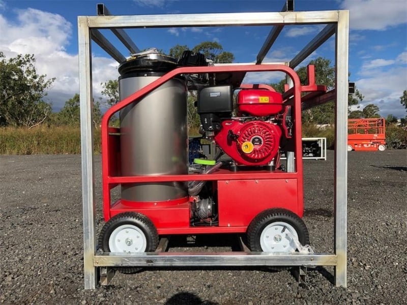 Unused Heated Pressure Washer / Water Blaster, 3600PSI, Key Start, Diesel Fired Burner, Various Spray Nozzles, Lance / Gurney, Wheels, Heavy Duty Steel Frame, Work Lights, Approximate Shipping Dimensions: 1200mm L x 1290mm H x 990mm W, Approximate Weight: 275kg Location: Shepparton, VIC