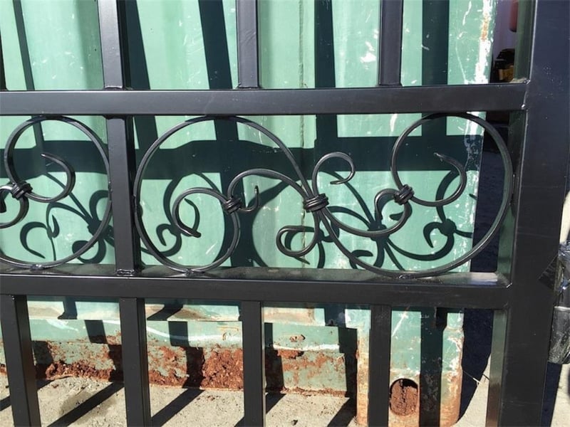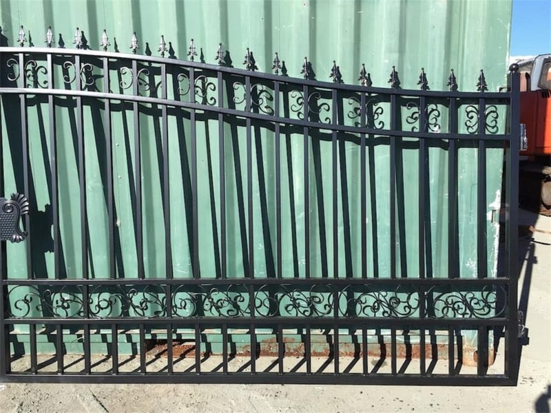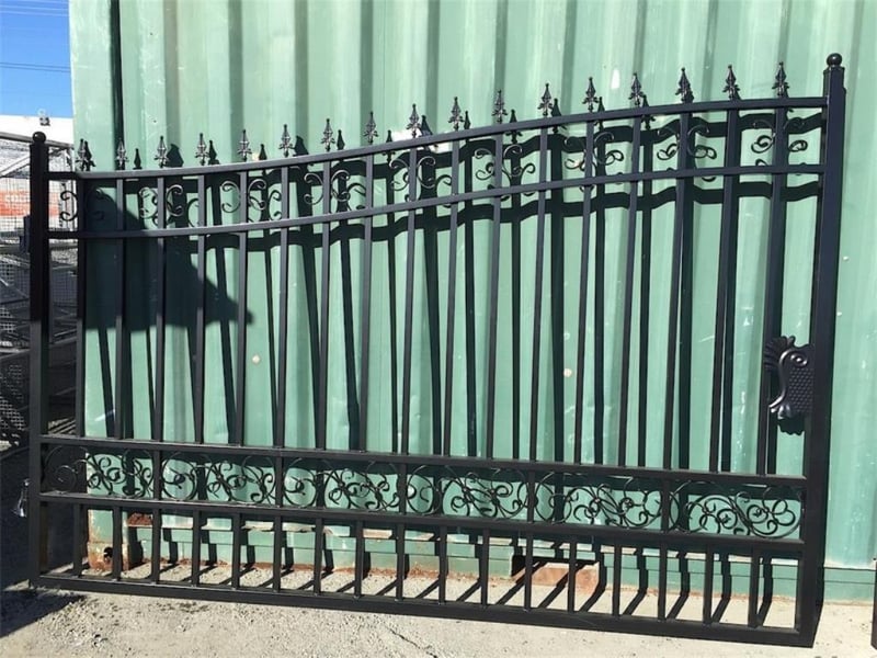 Set of 2 Unused Wrought Iron Style Gates, Each gate is 10ft wide, Height at High Side: 2.3m, Height at Low Side: 1.8m, made from Galvanised Steel, Approximate Combined Weight of both gates: 150kg Location: Shepparton, VIC