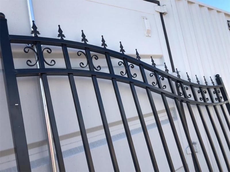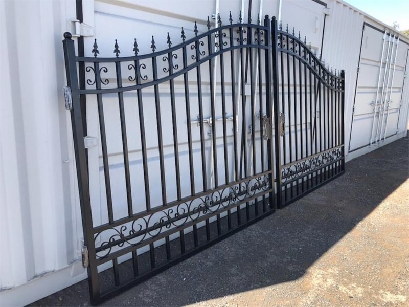 Set of 2 x 8ft Unused Wrought Iron Style Gates, Each gate is 8ft wide, Height at High Side: 2.3m, Height at Low Side: 1.8m, Made from Galvanised Steel, Approximate Combined Weight of both gates: 135kg Location: Shepparton, VIC
