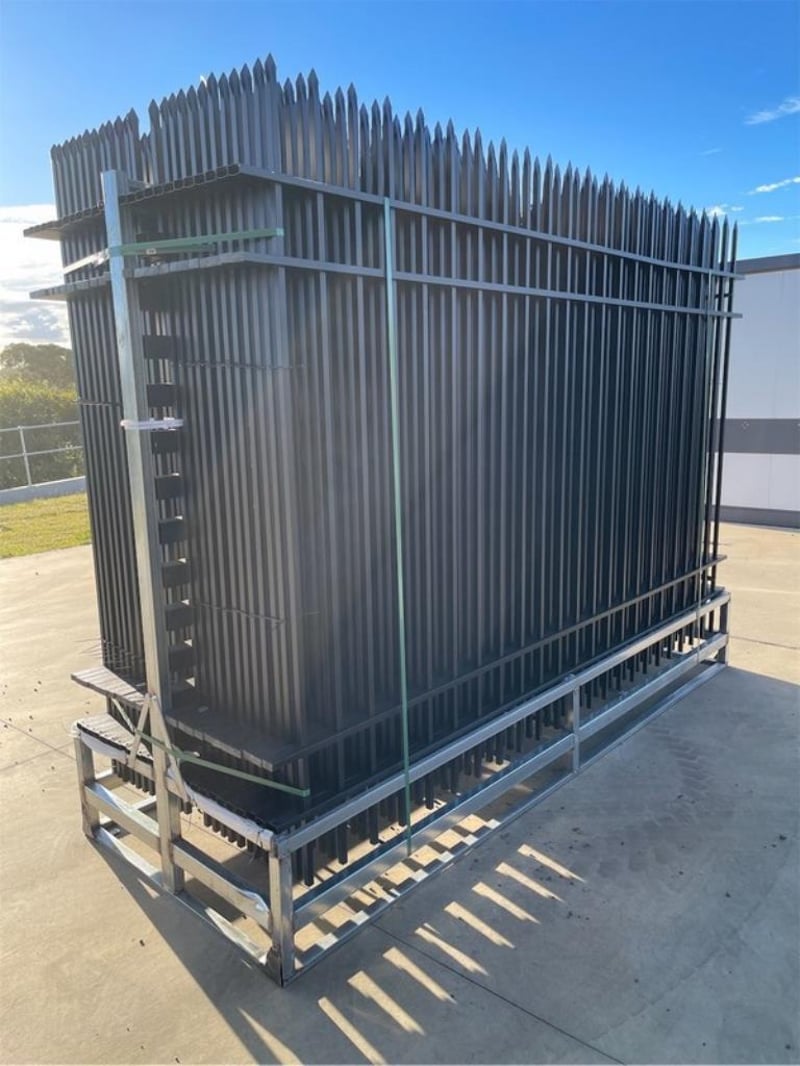 Qty of 24 Unused Wrought Iron Style Fence Panels, Comes with 24 Panels + 25 Posts, Each Panel is 10ft wide x 6ft 6in High, Rack Shipping Dimensions: 2.99m W x 1.1m L x 2.17m H, Weight: 950Kgs Location: Shepparton, VIC