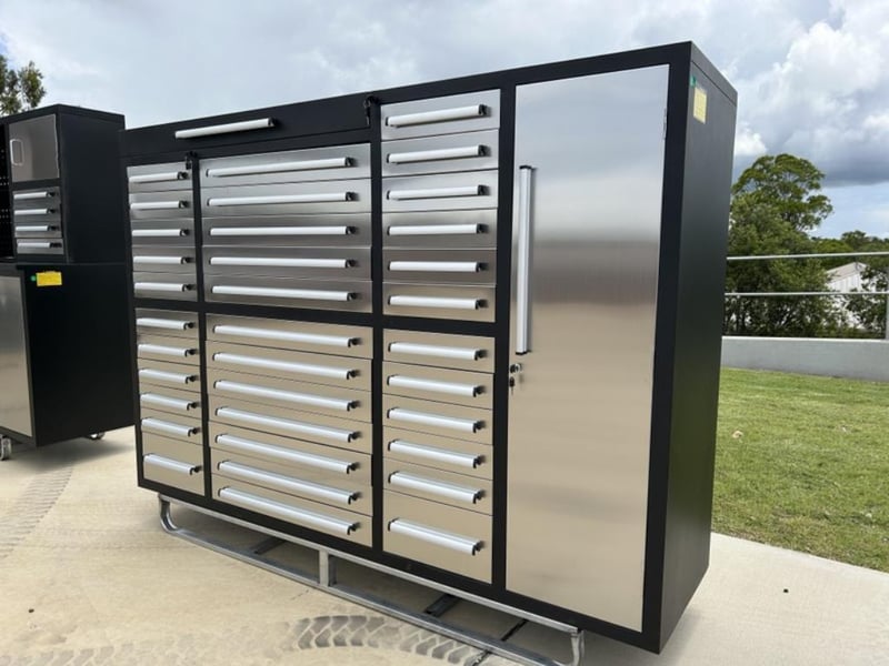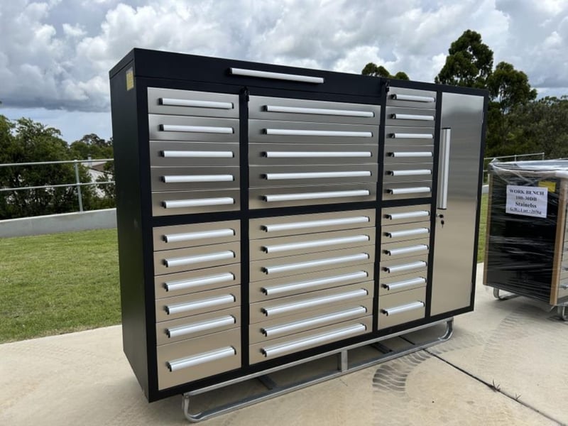 Unused 35 Drawer Stainless Steel Tool Storage Chest, Model: 7ft-35D, 35 Drawers, 3 Part Sliding Drawer System, Lockable Drawers – Various Sizes, Approximate Shipping Dimensions: L 2200mm x W 580mm x H 1600mm, Weight: 318Kg Location: Muchea, Perth WA