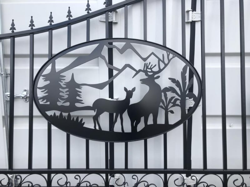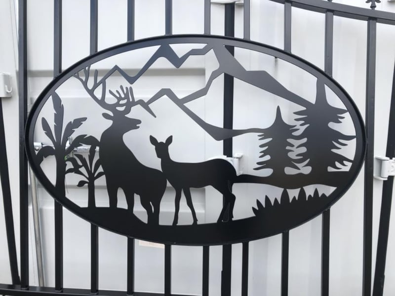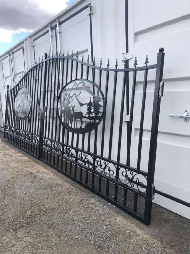 Set of 2 Large Unused Wrought Iron Style Gates with Wildlife Scene, Each gate is 10ft wide, Height at High Side: 2.3m, Height at Low Side: 1.8m, Made from Galvanised Steel, Total Approximate Combined Weight of both gates: 175kg Location: Muchea, Perth WA