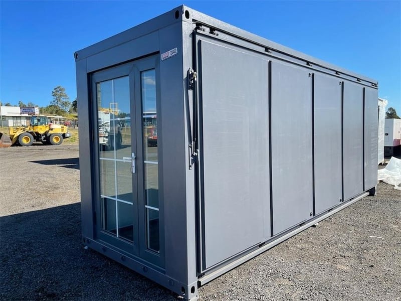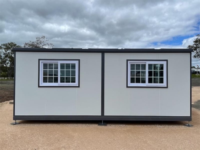 Unused Expandable Container House with Ensuite, Model: L0206, Includes: 8 Sliding lockable Windows, 1 x Door, Timber look flooring, Ensuite fitted with Shower, Toilet, Sink, Mirror, lockable door,Hot & Cold-water inlets, 2 waste outlets,Exhaust fan vent, Gas struts & winches for easy assembly, Size when opened out: 19ft x 20ft, Adjustable feet for easy levelling, Unit is folded up and ready for transport, Toilet, WELS Registration Number: L07047, Efficiency Star Rating 4, Water Consumption Full Flush 4.5 L / Half Flush 3.1 L,