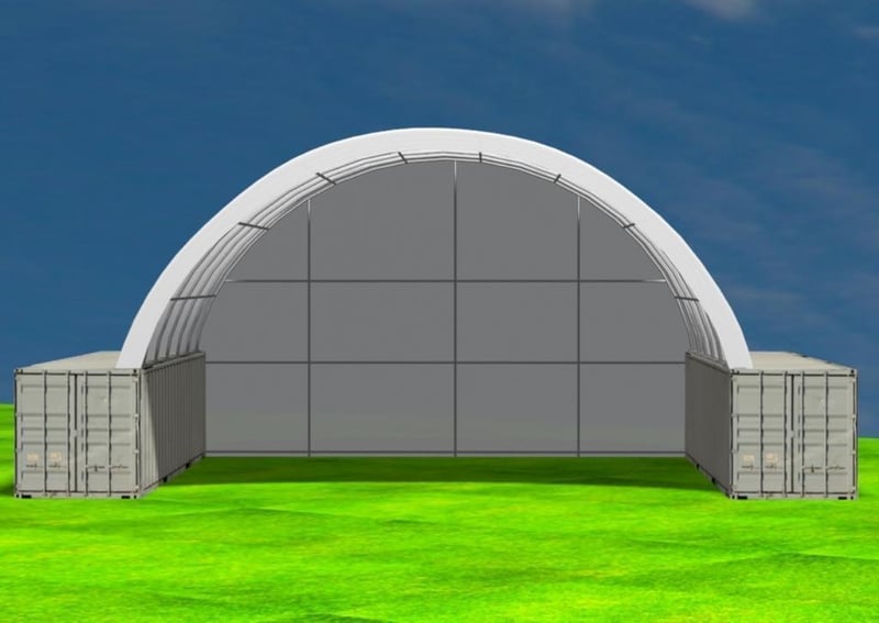 Unused Heavy duty 40ft Container Shelter with End wall, Model: C4040E, 40ft wide x 40ft long x 15ft High, Heavy duty PVC fabric, galvanised tube frame, Approximate Shipping Dimensions: 2430mm L x 740mm W x 1280mm H, Approximate Weight: 1150kg Location: Muchea, Perth WA