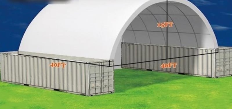 Unused Heavy duty 40ft Container Shelter with End wall, Model: C4040E, 40ft wide x 40ft long x 15ft High, Heavy duty PVC fabric, galvanised tube frame, Approximate Shipping Dimensions: 2430mm L x 740mm W x 1280mm H, Approximate Weight: 1150kg Location: Toowoomba, QLD
