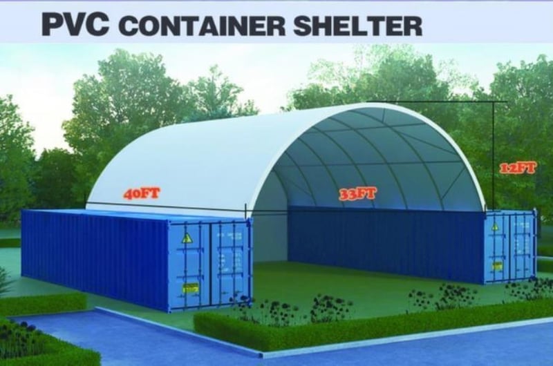 Unused Heavy duty 40ft Container Shelter with End Wall, Model: C3340E, 40ft long x 33ft wide x12ft high, Heavy duty PVC fabric, galvanised tube frame, Approximate Shipping Dimensions: 2830mm L x 750mm W x 1090mm H, Approximate Weight 1350kg Location: Shepparton, VIC