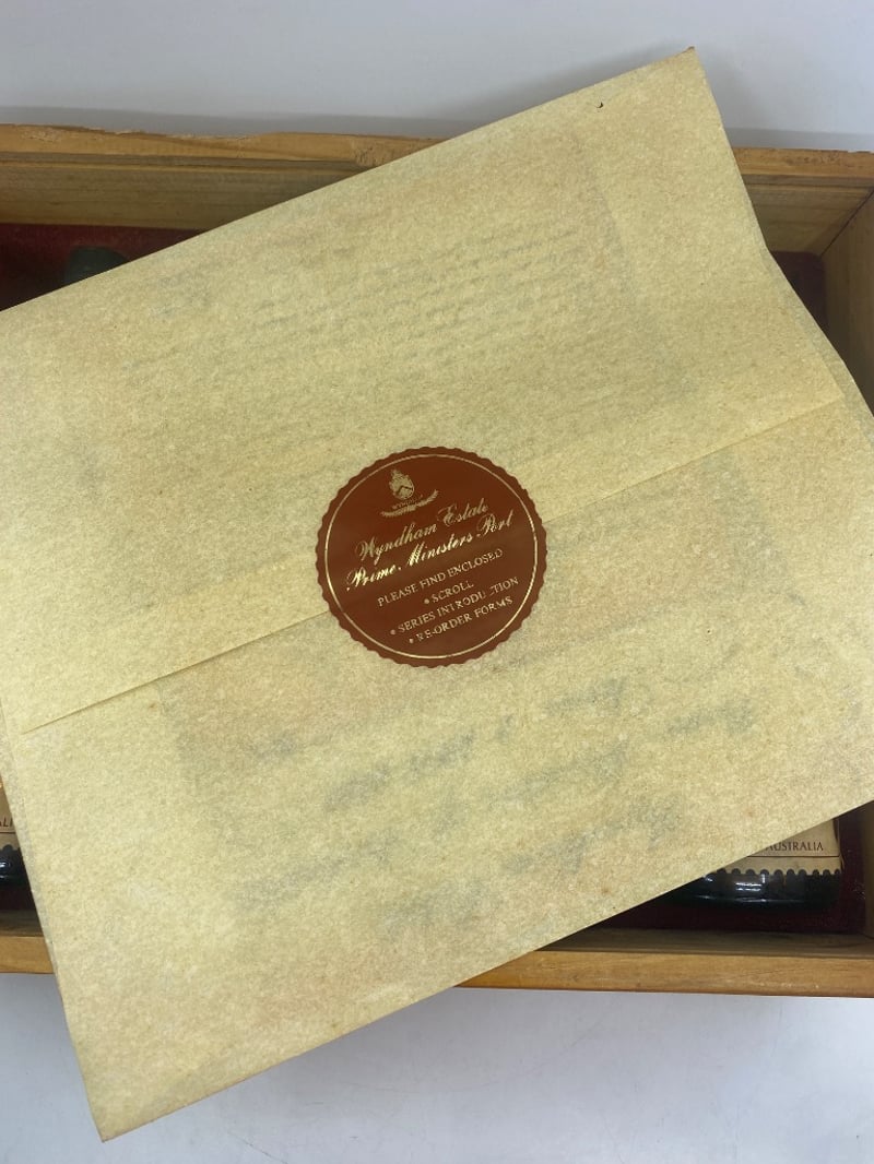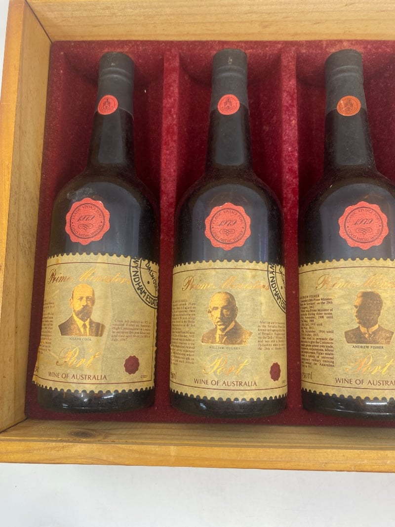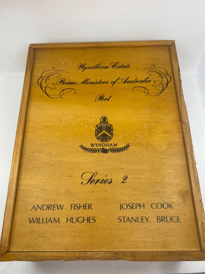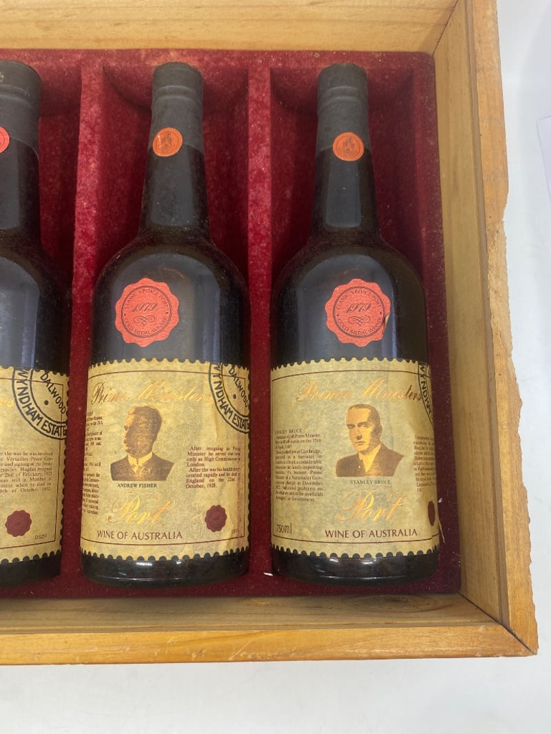 WYNDHAM ESTATE, PRIME MINISTER OF AUSTRALIA PORT, SERIES 2, JOSEPH COOK, WILLIAM HUGHES, ANDREW FISHER, STANLEY BRUCE. 750ML. D3251. 4X BOTTLES. 32CM X 42CM X 12CM