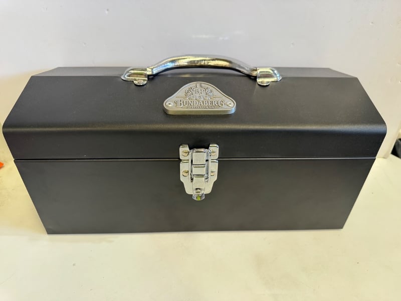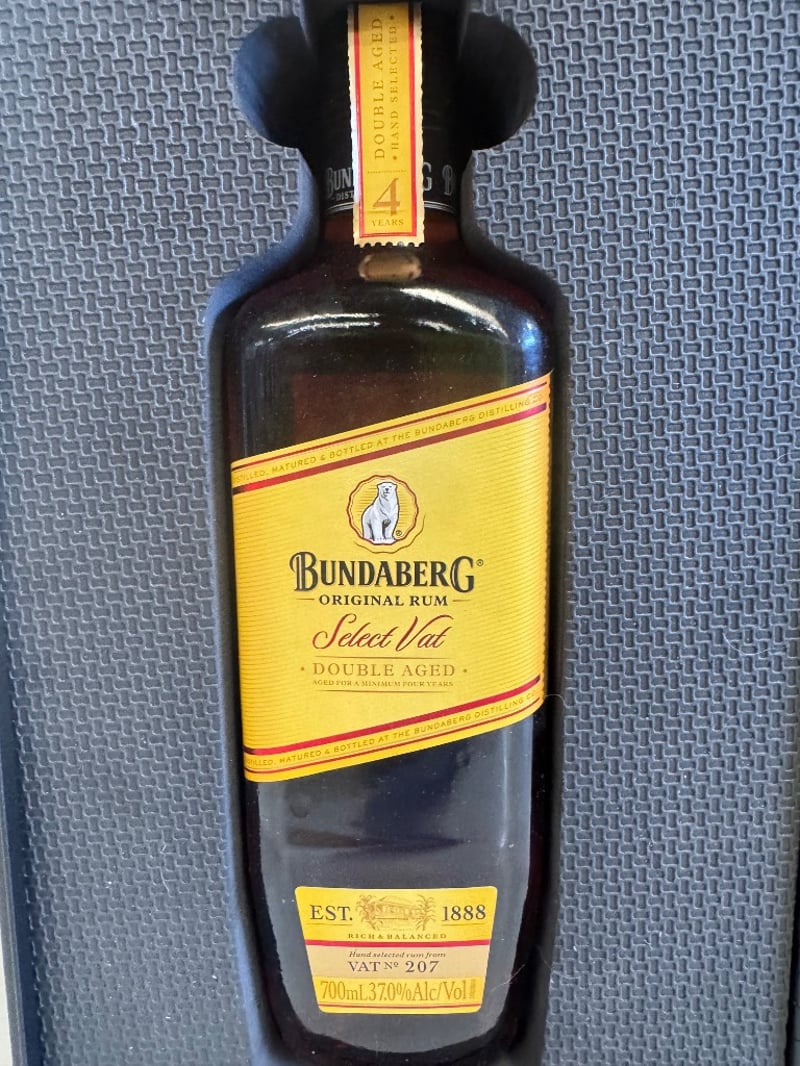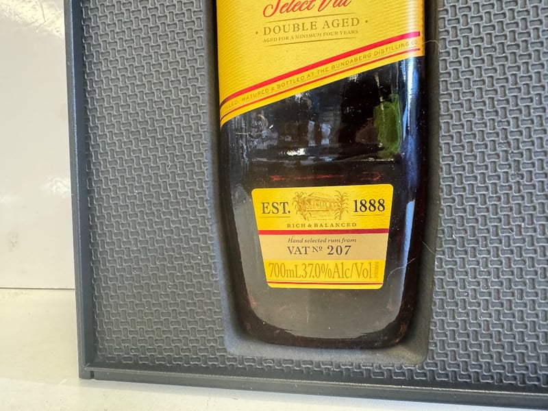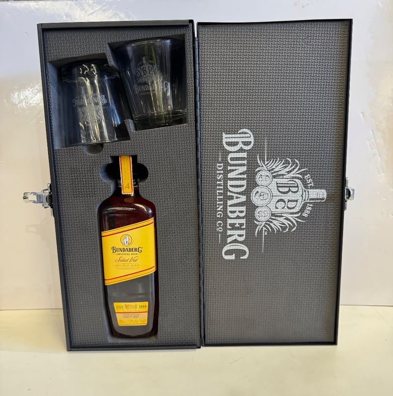 Bundaberg Select Vat Double Aged Rum gift set, established 1888. This premium Australian rum presentation includes a 700mL bottle (37% Alc/Vol) of Select Vat Double Aged rum, hand-selected from VAT No. 207, accompanied by two matching black glasses with etched branding. The set is housed in an elegant black presentation box with grey textured interior, gold-embossed Bundaberg branding, and dual metal latches. The bottle features the distinctive yellow and red label characteristic of Bundaberg's Select Vat range. The glasses are clear with frosted Bundaberg logos. Complete with original packaging and metal carrying handle on the presentation case.