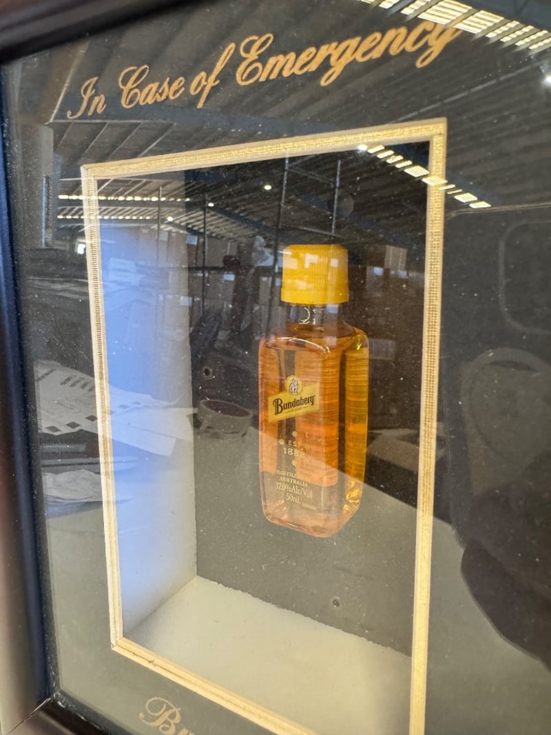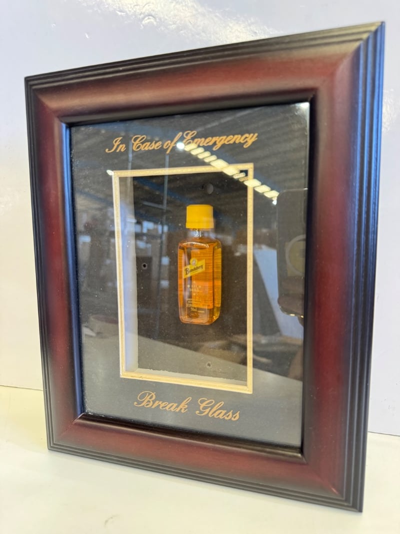 Vintage "In Case of Emergency" break glass wall-mounted display cabinet featuring a Bundaberg rum bottle with yellow cap. The framed piece consists of a dark wood/composite outer frame with burgundy/mahogany finish, housing a black-backed display panel with gold-leaf decorative text and border detailing. The interior showcases a suspended amber glass bottle (approximately 375ml) positioned centrally within a cream-coloured base section. The cabinet features a hinged glass front panel designed for emergency access. Gold script lettering reads "In Case of Emergency" at top and "Break Glass" at bottom. This decorative novelty item combines practical emergency bottle storage with aesthetic bar room appeal, representing mid-range hospitality memorabilia.