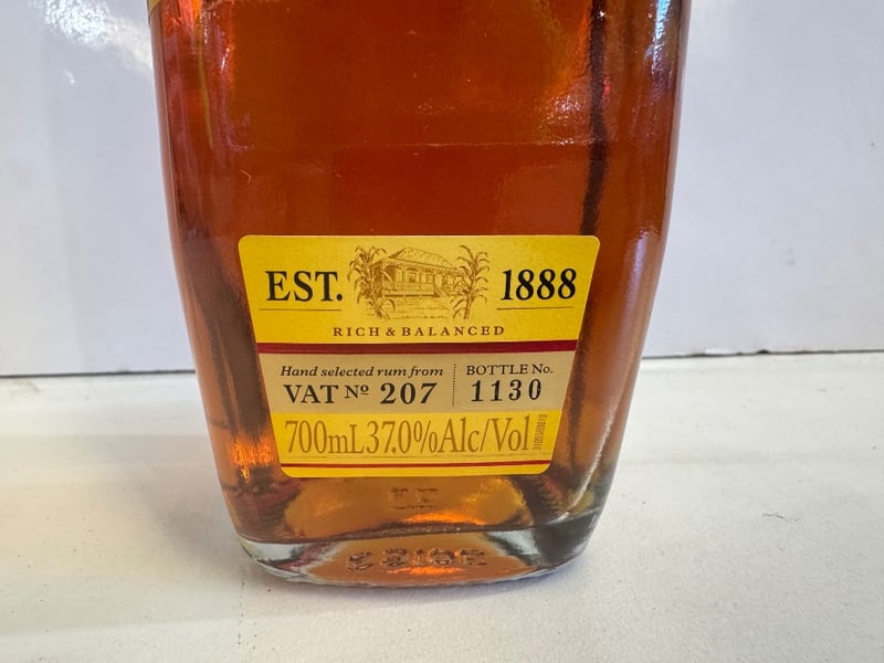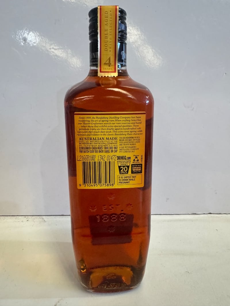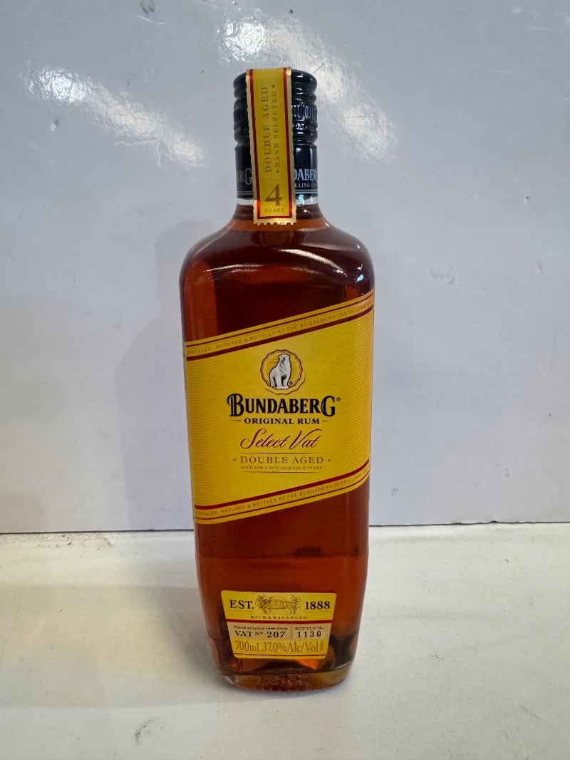 Bundaberg Original Rum Select Vat Double Aged, 700mL bottle, 37.0% Alc/Vol. Hand-selected rum from VAT No. 207, Bottle No. 1130. Australian-made spirit established 1888. Rich and balanced profile with double-aged maturation. Presented in original packaging with intact yellow and red label bands. VAT certification visible on back label with consumer enquiry details. Bottle exhibits rich amber-brown colouration consistent with aged rum profile.