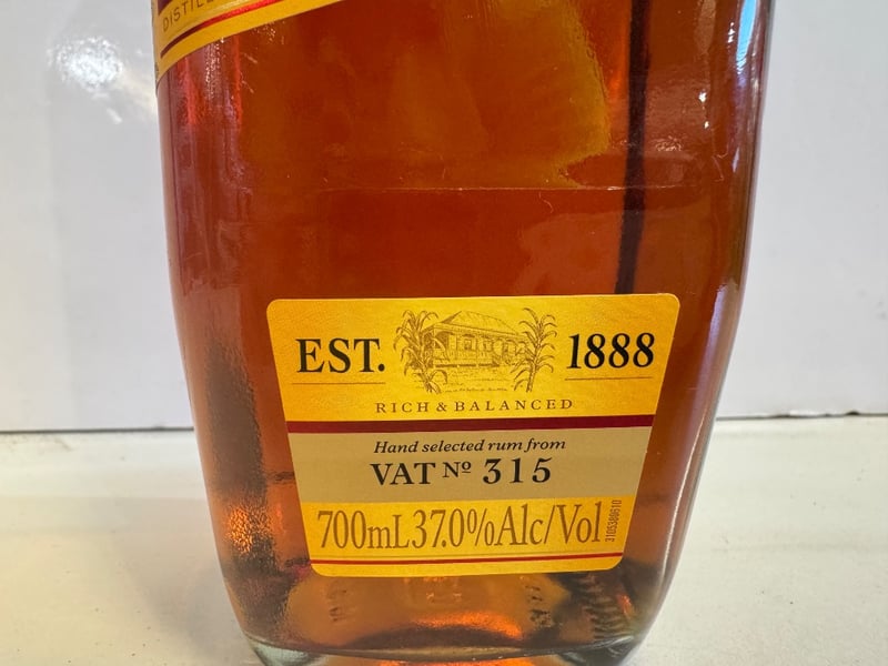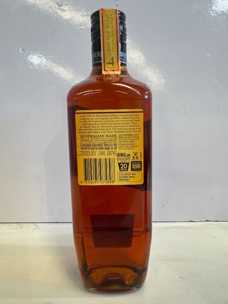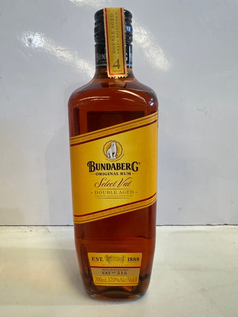Bundaberg Select Vat Original Rum, Double Aged, 4 Years. Australian-made rum from VAT No. 315, established 1888. 700mL bottle at 37.0% alcohol volume. Hand-selected rum described as "Rich & Balanced" on the label. The bottle features the characteristic Bundaberg bear logo and gold label with red band. Liquid level appears full. Condition reflects storage with minor label wear consistent with age.