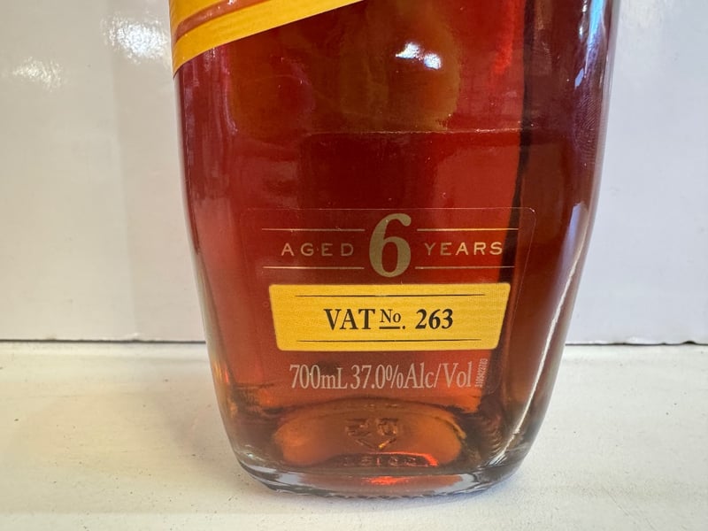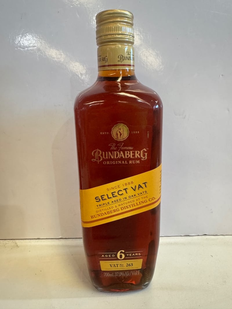 Bundaberg Original Rum Select Vat, a premium Australian rum aged 6 years in oak vats. Triple-aged expression produced by Bundaberg Distilling Company since 1888. VAT No. 263. 700ml bottle, 37.0% ABV. Golden-amber liquid with deep mahogany hues characteristic of aged Caribbean-style rum. Sealed with original brass screw cap. Australian-standard packaging with drink-wise labeling and drinkiq.com reference. Established heritage bottle from Queensland's iconic distillery.