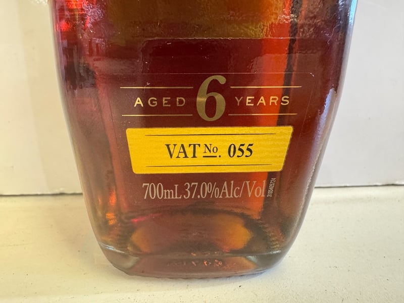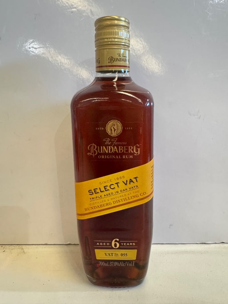 Bundaberg Select Vat Original Rum, aged 6 years, bottled in a 700mL container at 37.0% alcohol by volume. This Australian rum represents Vat No. 055 from the renowned Bundaberg Distillery, established 1888. The spirit has been triple aged in oak vats, developing a deep amber complexion characteristic of premium dark rum. The bottle features the iconic gold foil-sealed cap and distinctive labeling. The rum exhibits the traditional complexity and smoothness expected from a six-year maturation process. Standard drinks measure approximately 20 per bottle. Product includes standard health warnings regarding pregnancy and responsible consumption messaging.