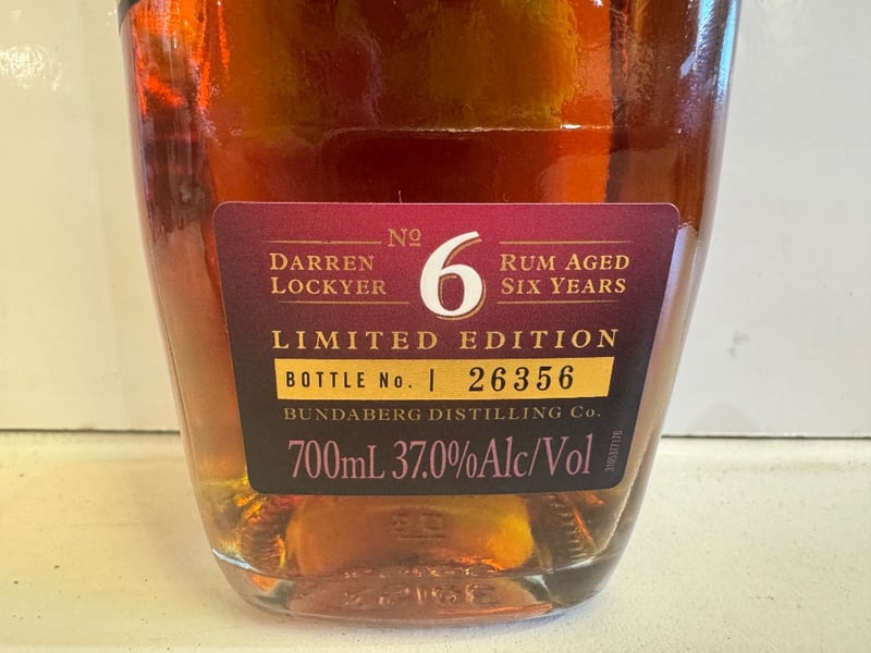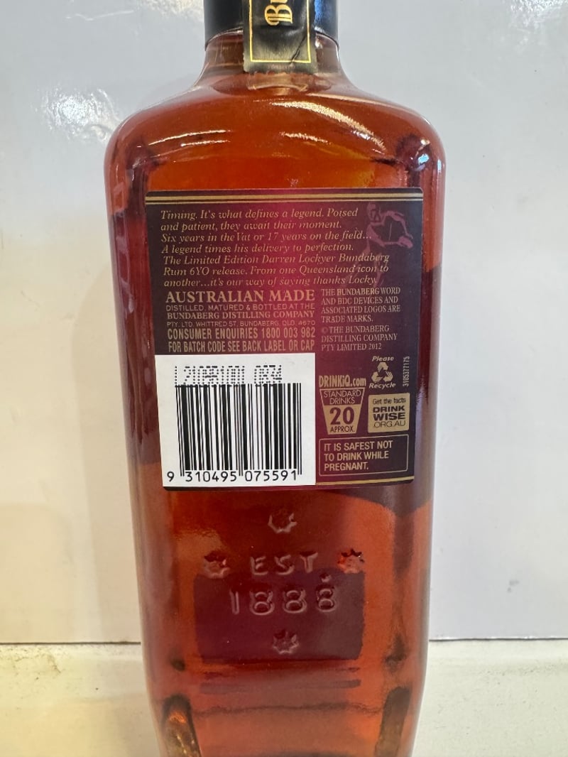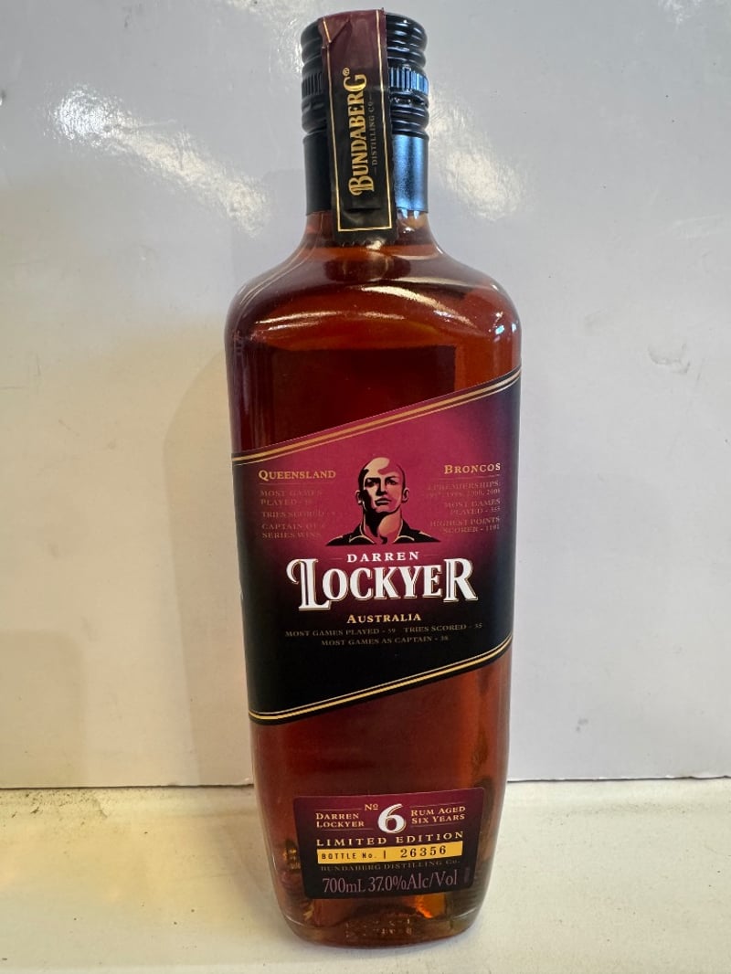 Darren Lockyer No. 6 Rum Aged Six Years Limited Edition bottle by Bundaberg Distilling Co. This is a premium Australian rum featuring Darren Lockyer, Queensland Broncos legend and rugby league icon. Aged six years, bottled at 37.0% alcohol by volume. 700ml limited edition release, bottle number 26356 from the exclusive series. The bottle showcases deep amber liquid in a dark glass container with black and gold foil-sealed cap. Label features Lockyer's portrait, Queensland Broncos branding, and commemorative text detailing his sporting achievements. Distilled, matured and bottled at Bundaberg Distilling Company, Queensland. Perfect for collectors of Australian spirits and rugby league memorabilia.