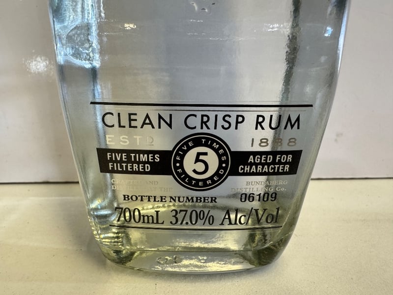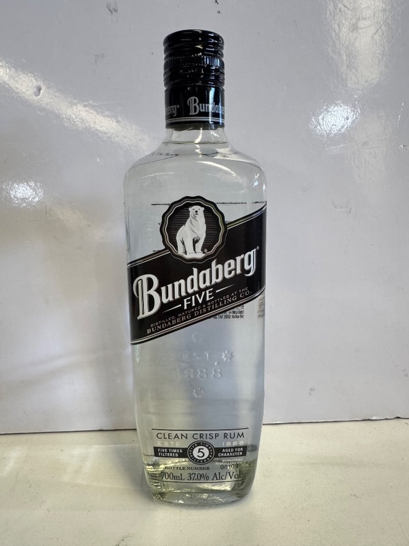 Bundaberg Five Times Filtered Australian Rum, 700mL bottle at 37.0% ABV. This clean crisp rum from the Bundaberg Distilling Co. has been aged for character and distilled five times for purity. Established 1888, this iconic Australian spirit is crafted from local sugar cane. Bottle number 06109. The bottle features the distinctive polar bear emblem on the label and includes back label detailing the distillery's heritage and production methods. Full sealed condition with intact black screw cap closure. A premium spirit collectible with provenance tracing to Australia's renowned rum-making tradition.