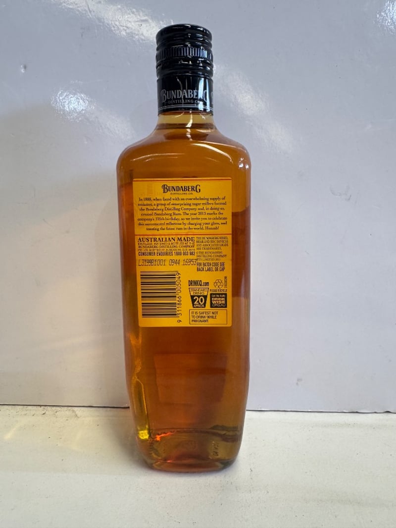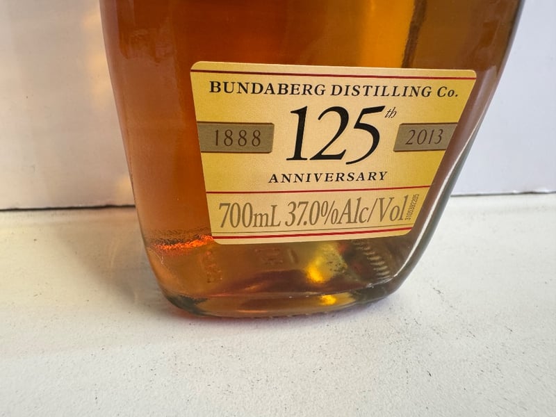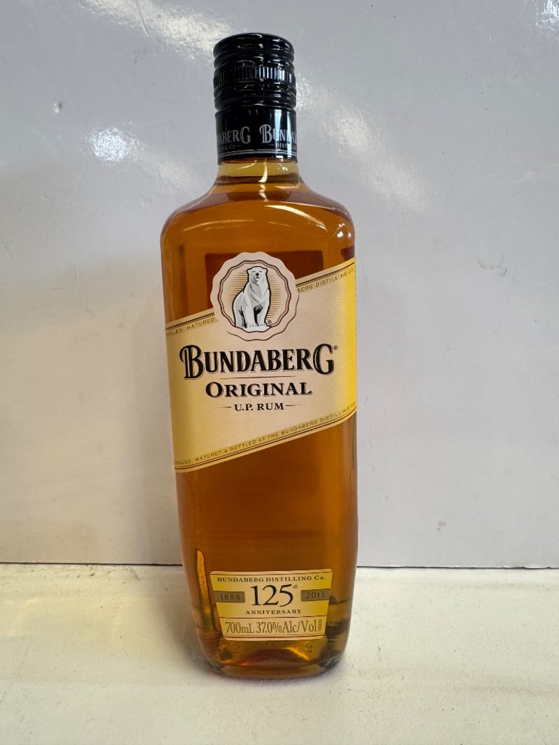 Bundaberg Original U.P. Rum 125th Anniversary Edition, 700mL bottle at 37.0% alcohol by volume. This commemorative release celebrates the Bundaberg Distilling Company's 125-year heritage (1888-2013). Australian-made rum featuring the distillery's signature polar bear logo on the front label. The bottle includes detailed historical narrative on the back label describing the company's origins in 1888 and its journey through 125 years of rum production. Black plastic screw cap closure. Label in excellent condition with clear gold and cream-colored anniversary branding. Suitable for collection or display purposes.
